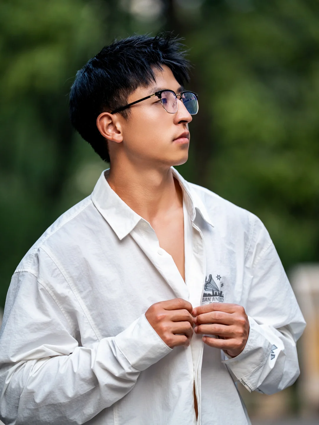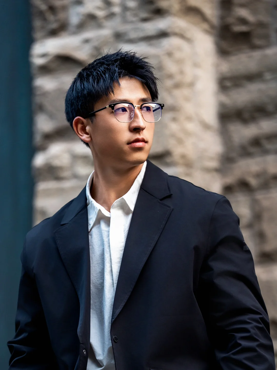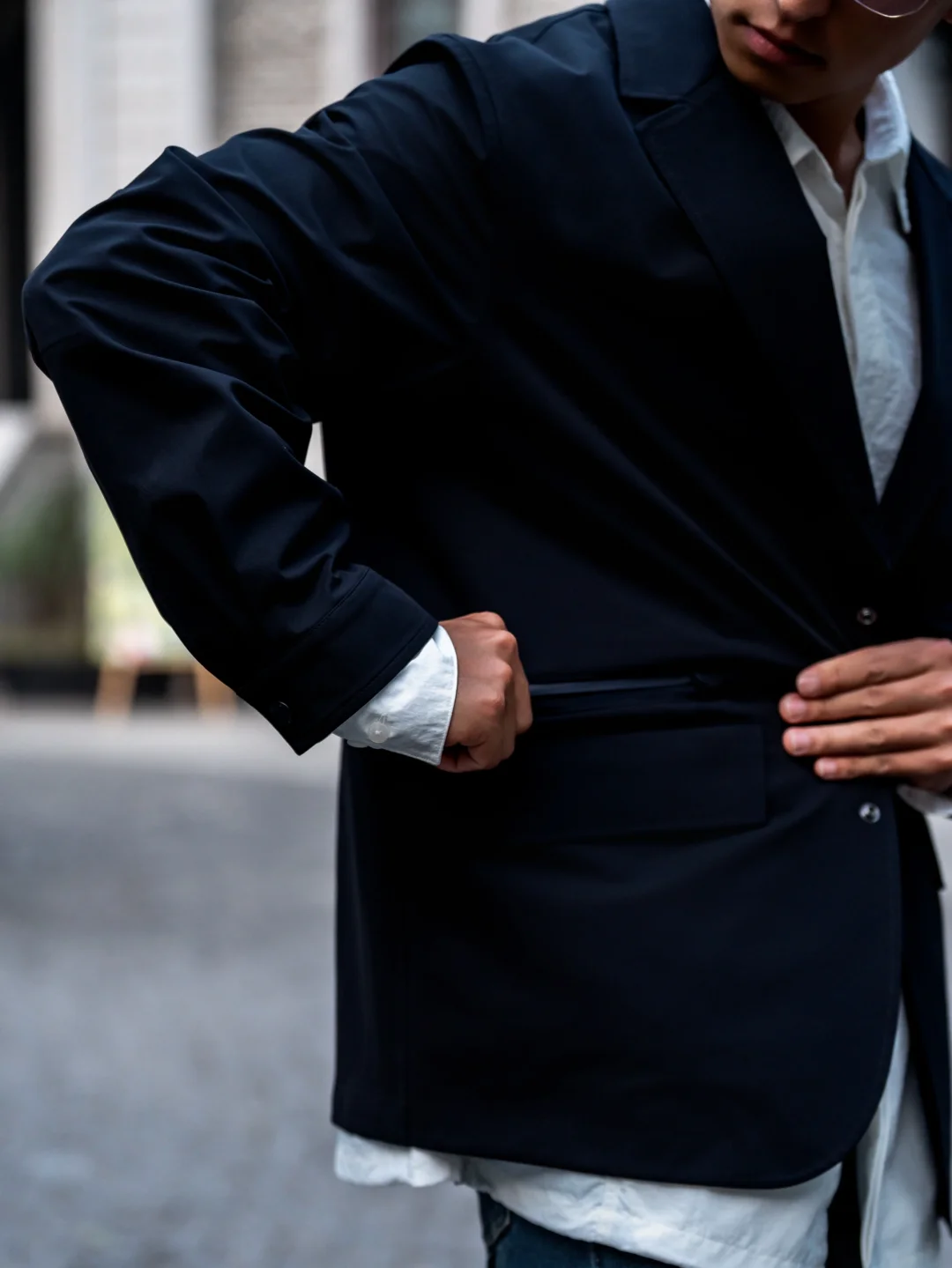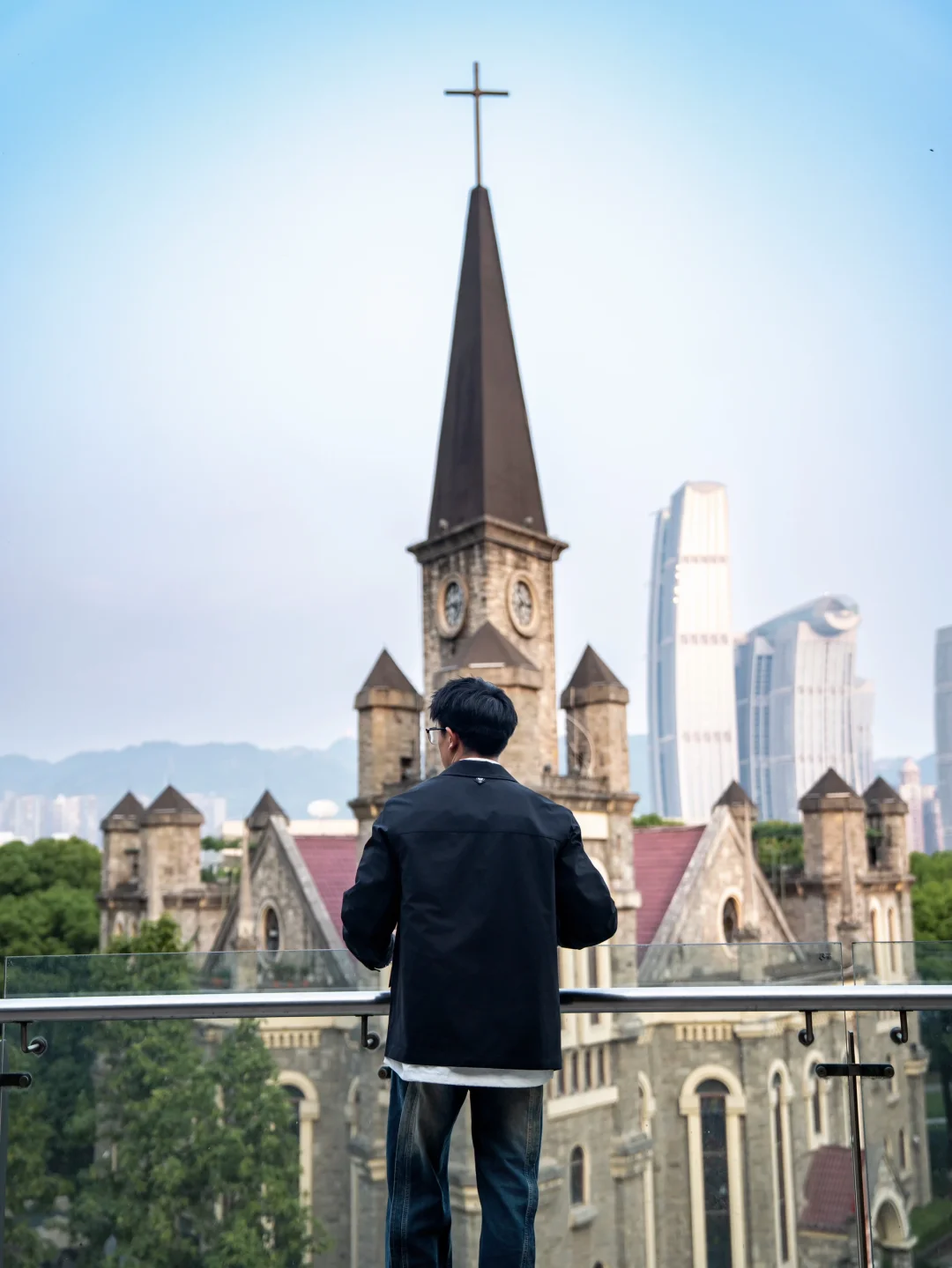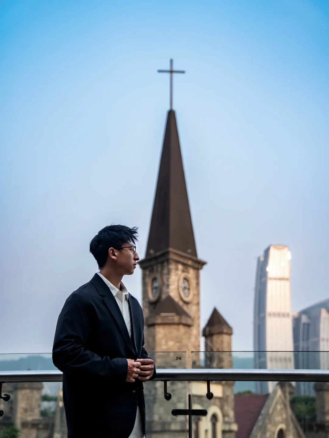 内搭纯色衬衫+牛仔裤,西装袖口随意卷起。福音堂前阶梯坐下,让阳光透过外套防水面料折射出光泽——这一程,你是街头信徒,也是潮流布道者。