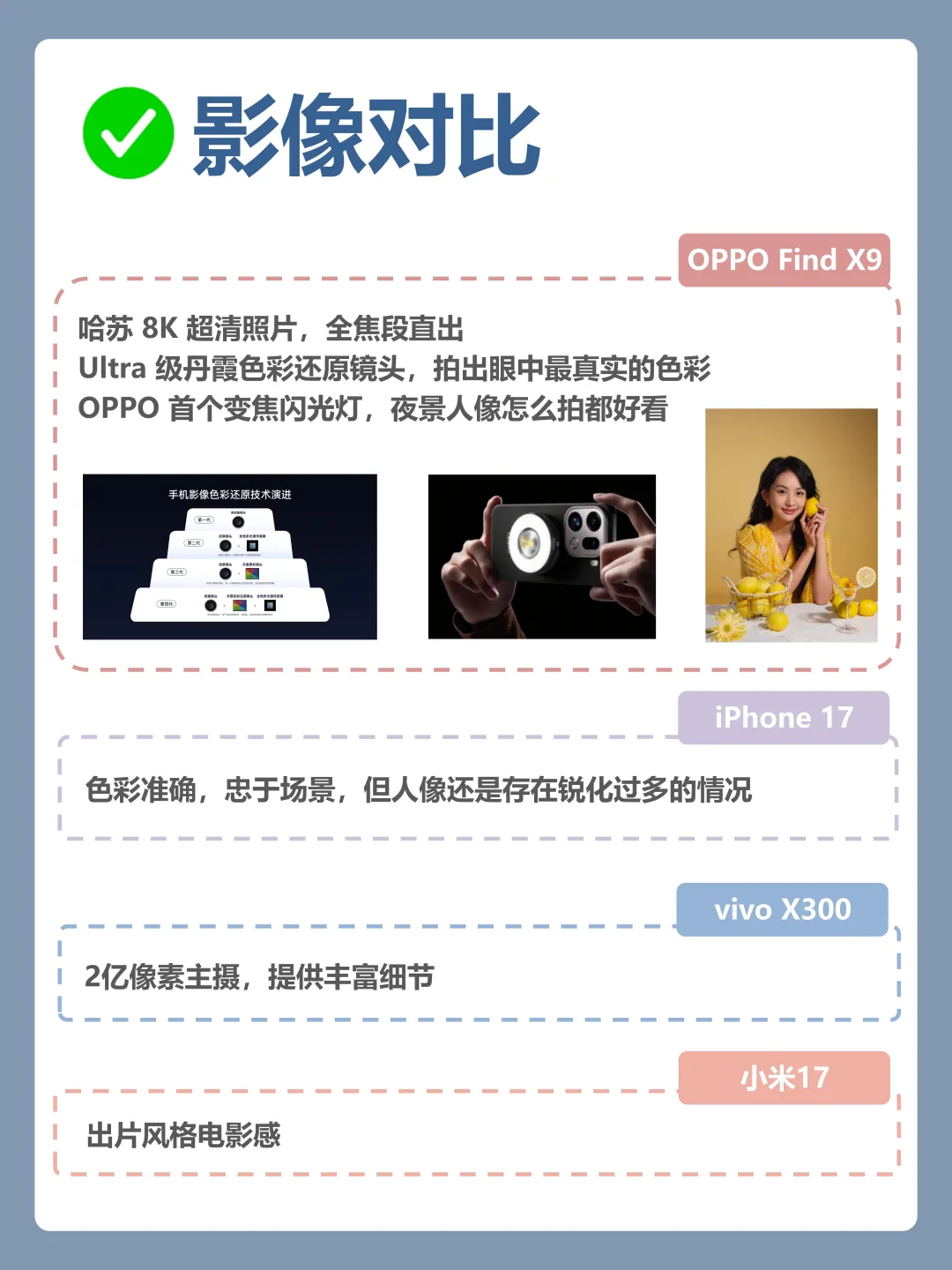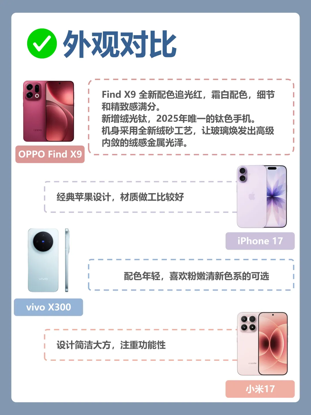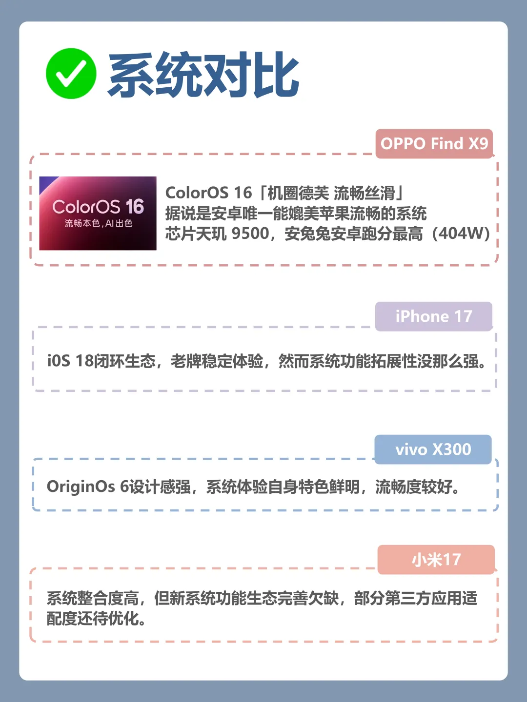 [向右R]真的不得不说哎~ 今年各家标准版旗舰机都挺有看点的,但仔细一比,OPPO Find X9 真的有点东西。作为标准版,综合素质相当能打,可以说的上是全面好”苹“,尤其是这四点—— [偷笑R] 外观质感上Find X9 这次用了全新的「绒砂工艺」,玻璃背板做出了绒感金属光泽,上手真的很高级。配色也很有说法:追光红超有辨识度、霜白细腻耐看、绒光钛也是今年唯一钛色手机!对比下来,OPPO的质感明显更精致,喜欢粉嫩喜欢大圆镜组可以看看vivo,但要说高级感——还得是OPPO。 [哇R] 论系统流畅度OPPO这次采用ColorOS 16,动效流畅很丝滑,安卓里能跟iOS掰手腕的恐怕只有它。天玑9500 + 404万安兔兔跑分,性能也不用担心。iPhone 17闭合生态,但系统功能拓展性没那么强,vivo和小米系统各有特点,但流畅稳定度还是OPPO更稳。 🔋要说电池续航,都2025年了,真·旗舰标准版就该配7000mAh!Find X9直接上了7025mAh,重度使用一天无压力,出门根本不用借充电宝。 📸就影像能力Find X9全系标配Ultra级丹霞色彩还原镜头,色彩真实耐看。还首发4K超清Live照片和哈苏8K照片,尤其是人像——OPPO拍人一直在线,变焦闪光灯+算法加持,夜景人像也清晰自然。相比之下,iPhone 17拍照存在锐化,小米拍逆光还行,vivo细节虽多但整体调色偏浓。 [害羞R]总结一下: 如果你追求综合体验均衡,Find X9可能是今年zui强标准版——质感在线、系统流畅、续航顶、影像强,尤其是拍人和续航这两块,优势明显。换机优先考虑它,准没错。 FindX9 全面好评 OPPOFindX9 我的第一张 4K 超清 Live