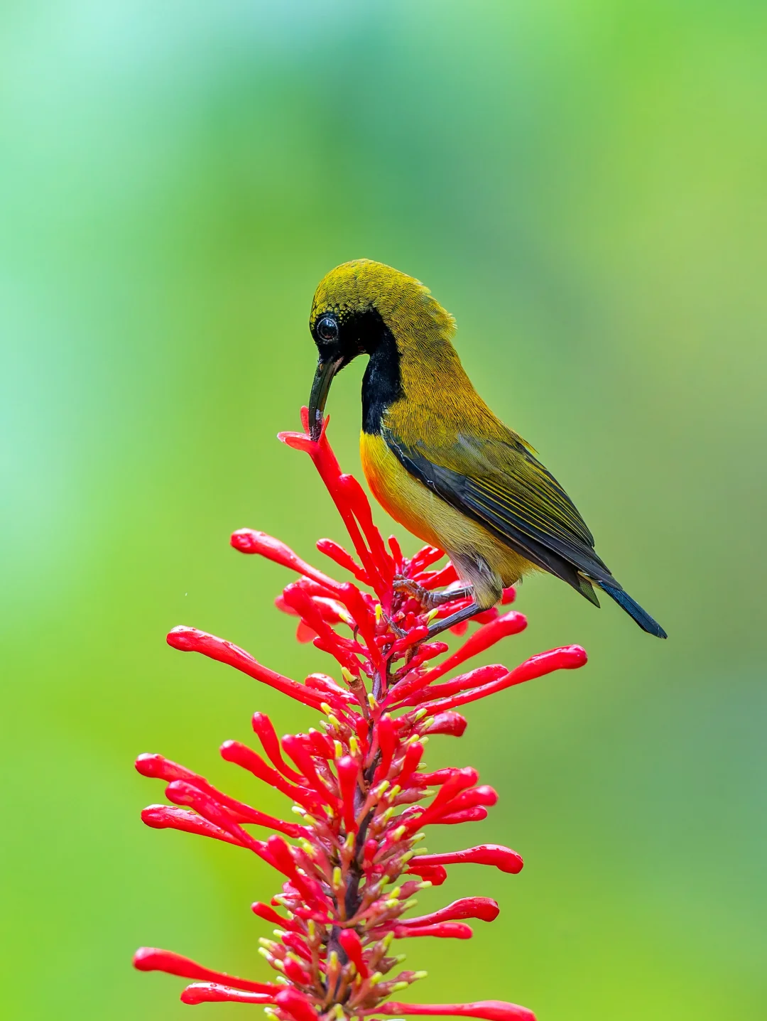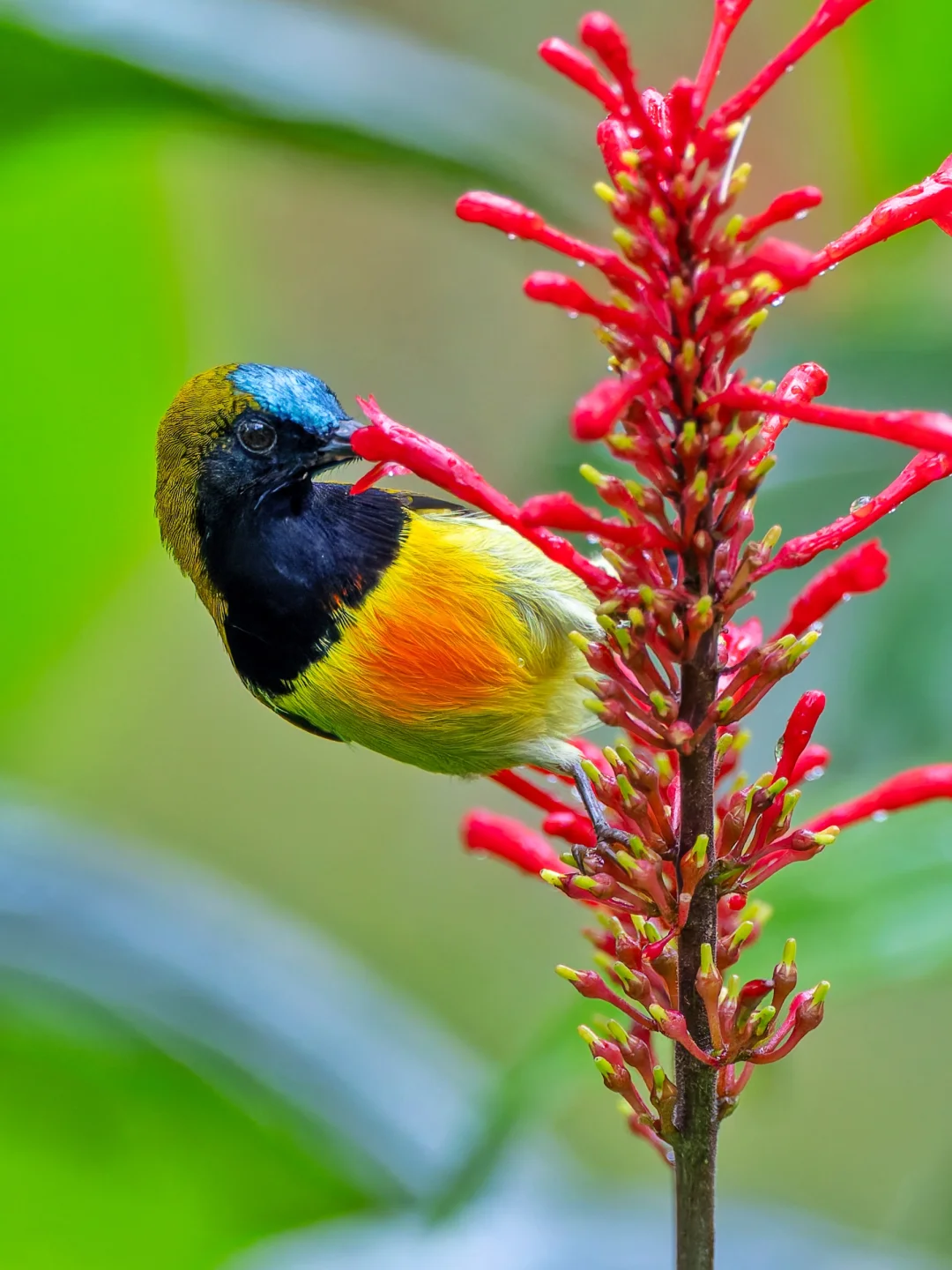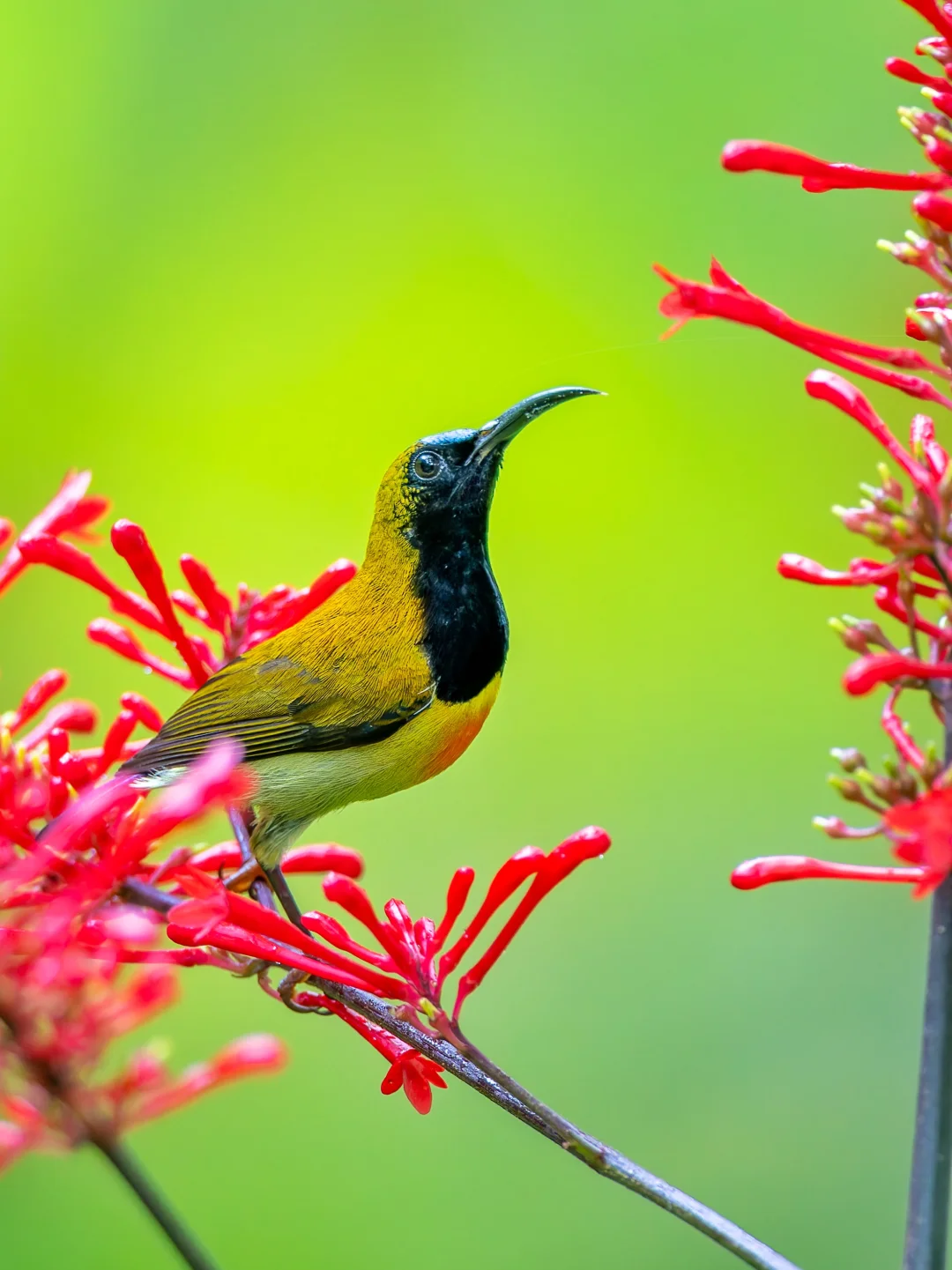 原创拍摄于2025.10 火红太阳鸟,Flaming Sunbird,雀形目太阳鸟科太阳鸟属。是一种生活在吕宋岛的独特太阳鸟。 火红太阳鸟的英文名字就是燃烧的火焰,这主要是描述雄鸟胸前的一抹红色,像是热情火焰。同时雄鸟有黑色的脸庞,以及带有蓝绿金属光泽的前额,和紫色的喉部。雌鸟(p9,p10)较为暗淡,喉部灰白。 这个种群的火红太阳鸟,好像每天都会在定点来吸食这些甜蜜的花蜜,而且吸花蜜的时候非常的忘我,就算我靠近他身边,他也不会飞走,继续享受甜蜜。