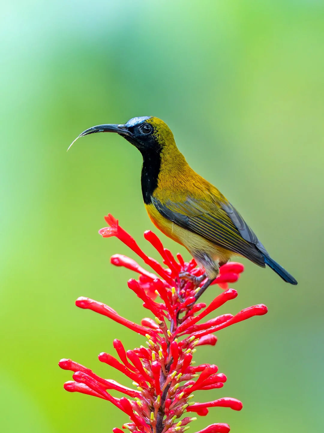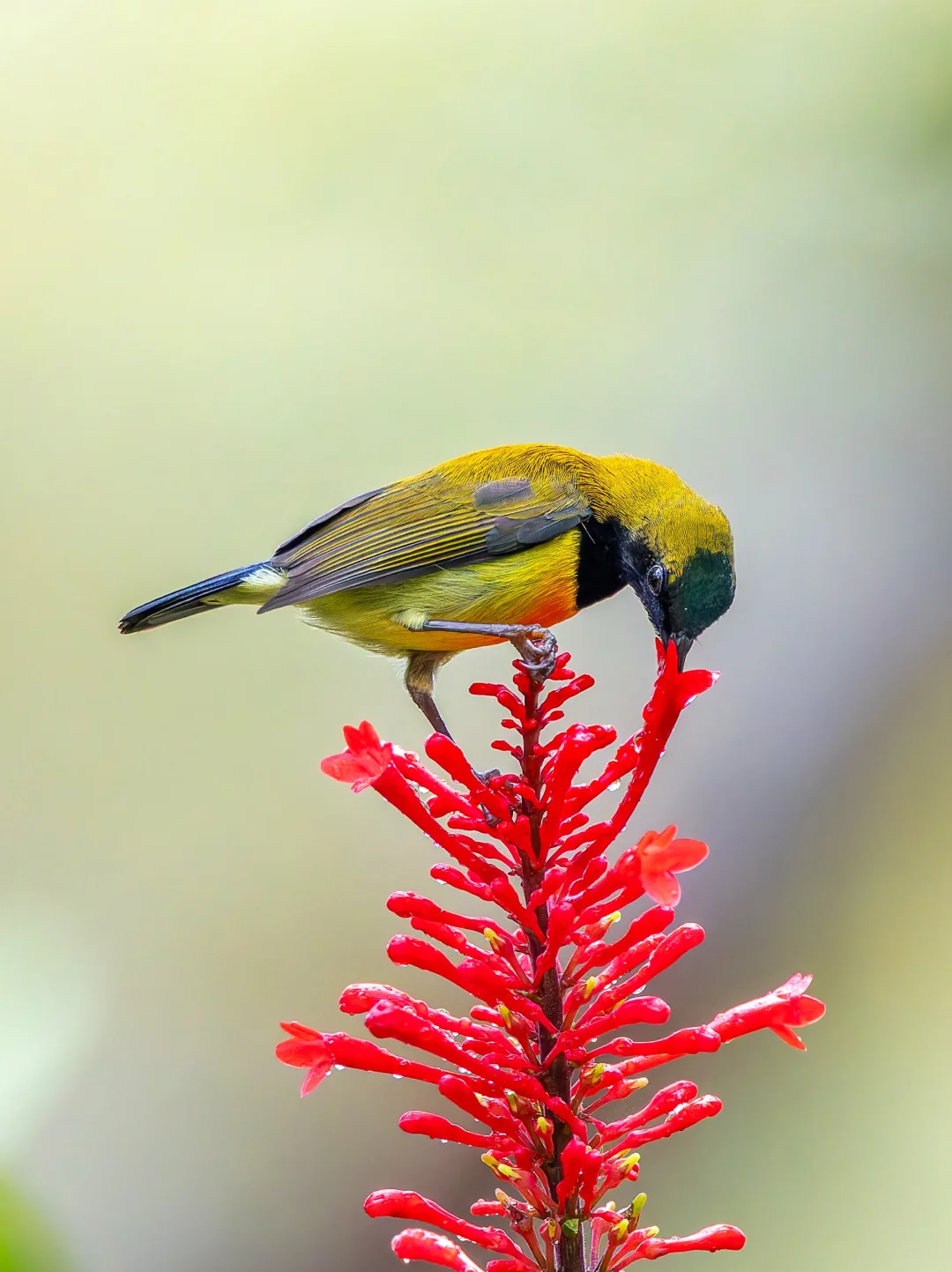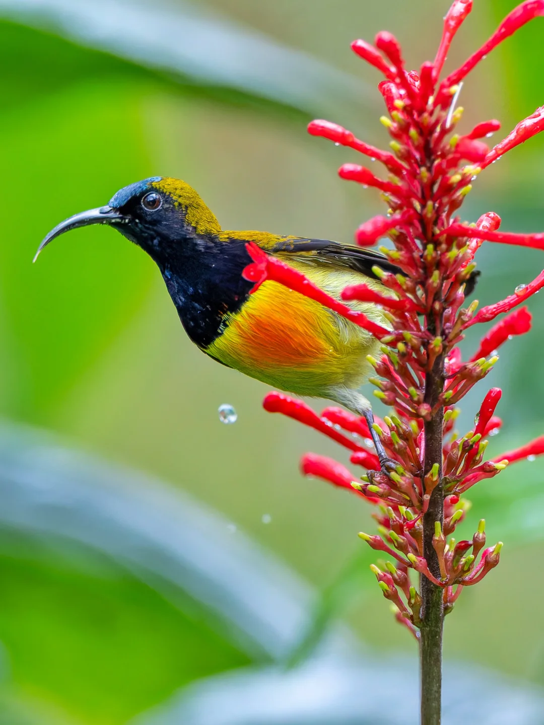 原创拍摄于2025.10 火红太阳鸟,Flaming Sunbird,雀形目太阳鸟科太阳鸟属。是一种生活在吕宋岛的独特太阳鸟。 火红太阳鸟的英文名字就是燃烧的火焰,这主要是描述雄鸟胸前的一抹红色,像是热情火焰。同时雄鸟有黑色的脸庞,以及带有蓝绿金属光泽的前额,和紫色的喉部。雌鸟(p9,p10)较为暗淡,喉部灰白。 这个种群的火红太阳鸟,好像每天都会在定点来吸食这些甜蜜的花蜜,而且吸花蜜的时候非常的忘我,就算我靠近他身边,他也不会飞走,继续享受甜蜜。