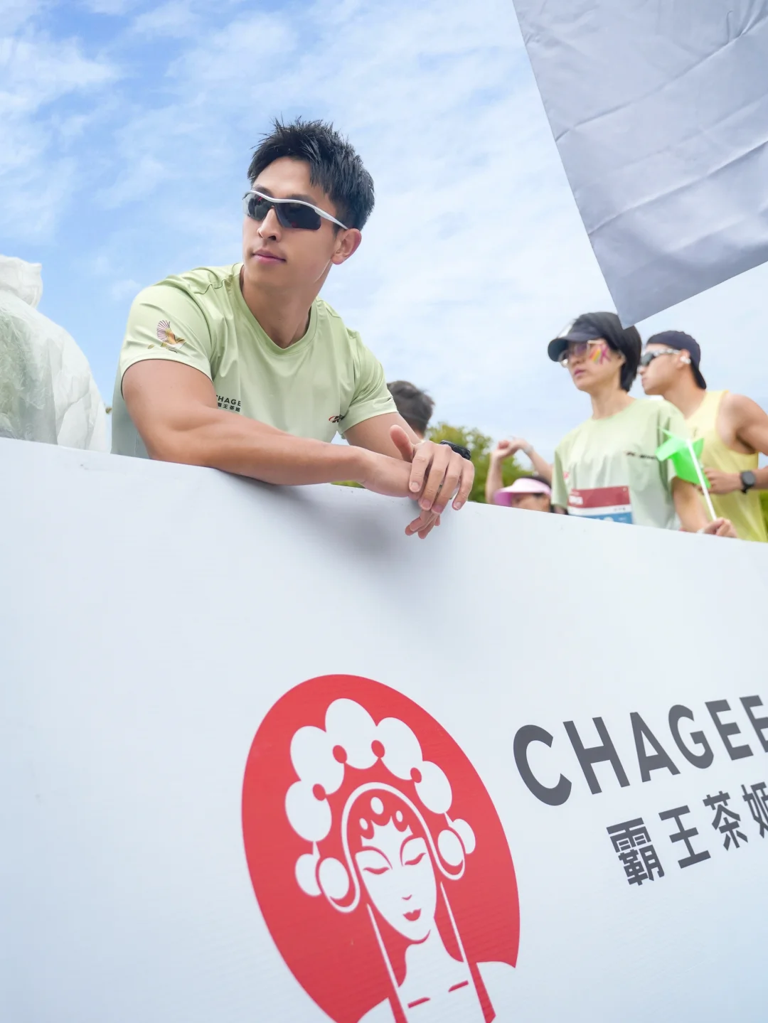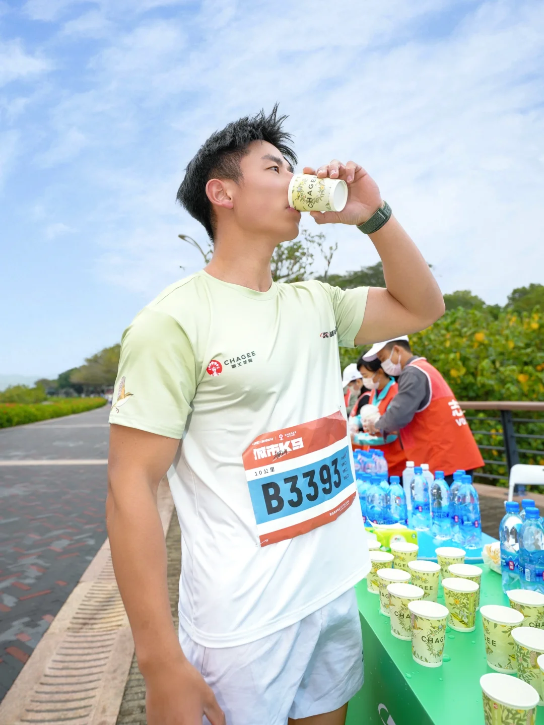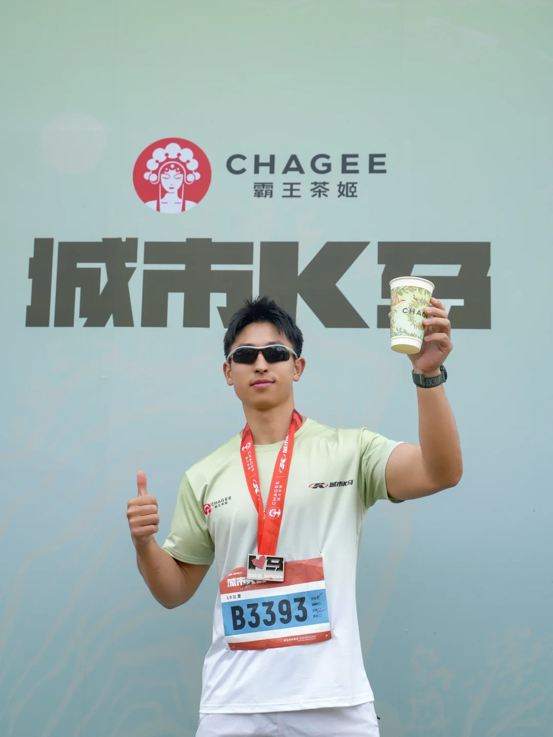 跑到五公里处一抹熟悉的青绿色撞进视线:霸王茶姬的补给站,志愿者们递来迷你版小绿杯,冰爽茶汤混着龙井香直冲天灵盖。举杯和跑友碰了个“茶”。