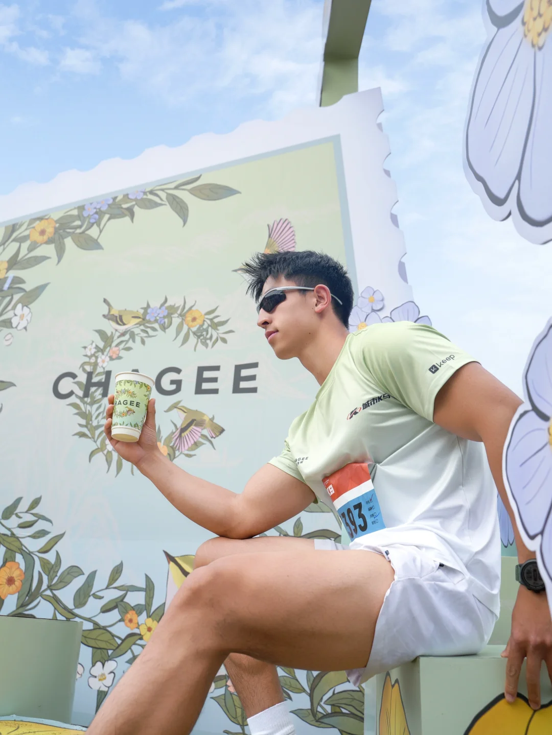 清晨我别上号码牌,顺手拿起领到的「醒时春山」小绿杯。轻乳茶的清润滑过喉咙。减负70%的配方果然没负担,——今天的状态,稳了!