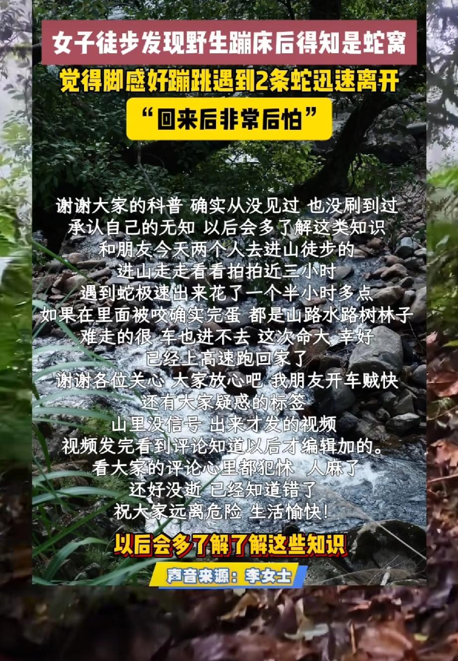 江西女子把蛇窝当蹦床跳,网友看视频吓出冷汗:这运气能买彩票了 这事发生在10月26日,江西上饶的李女士和朋友去山里徒步,路上碰到个枯叶堆成的土包,踩上去软绵绵的,俩人觉得像“野生蹦床”,又跳又拍视频玩了好一阵。 后来附近窜出两条蛇,一条棕黑像木棍,另一条头是扁的,她们才赶紧跑下山。 没信号的山路走了快一个半小时,要是真被咬了,求救都难。 回去后李女士把视频发上网,结果网友直接炸锅了,有人一眼认出那枯叶堆是眼镜王蛇的窝,直径越大说明蛇越多,可能底下缠着几十条蛇加蛇蛋。 更吓人的是,这种蛇护巢不要命,毒液能半小时要人命,死亡率九成。李女士知道后秒删视频,估计后背都湿透了。 其实眼镜王蛇的窝特好认,枯叶堆得鼓鼓的,常藏在树根草窝里。但当时她光顾着拍视频,没留意环境。 得亏是10月底天冷蛇懒,要是夏天活跃期,惊动了整窝蛇,后果不敢想。再说徒步装备,没卫星电话没急救包,纯靠胆子硬闯,真是运气爆棚才没出事。 这事与其说惊险,不如说给所有户外人提了个醒:自然不是游乐场,好奇心得配常识。下次山里看见奇怪的土包,记得绕道走,你的命,可比一条视频值钱多了。