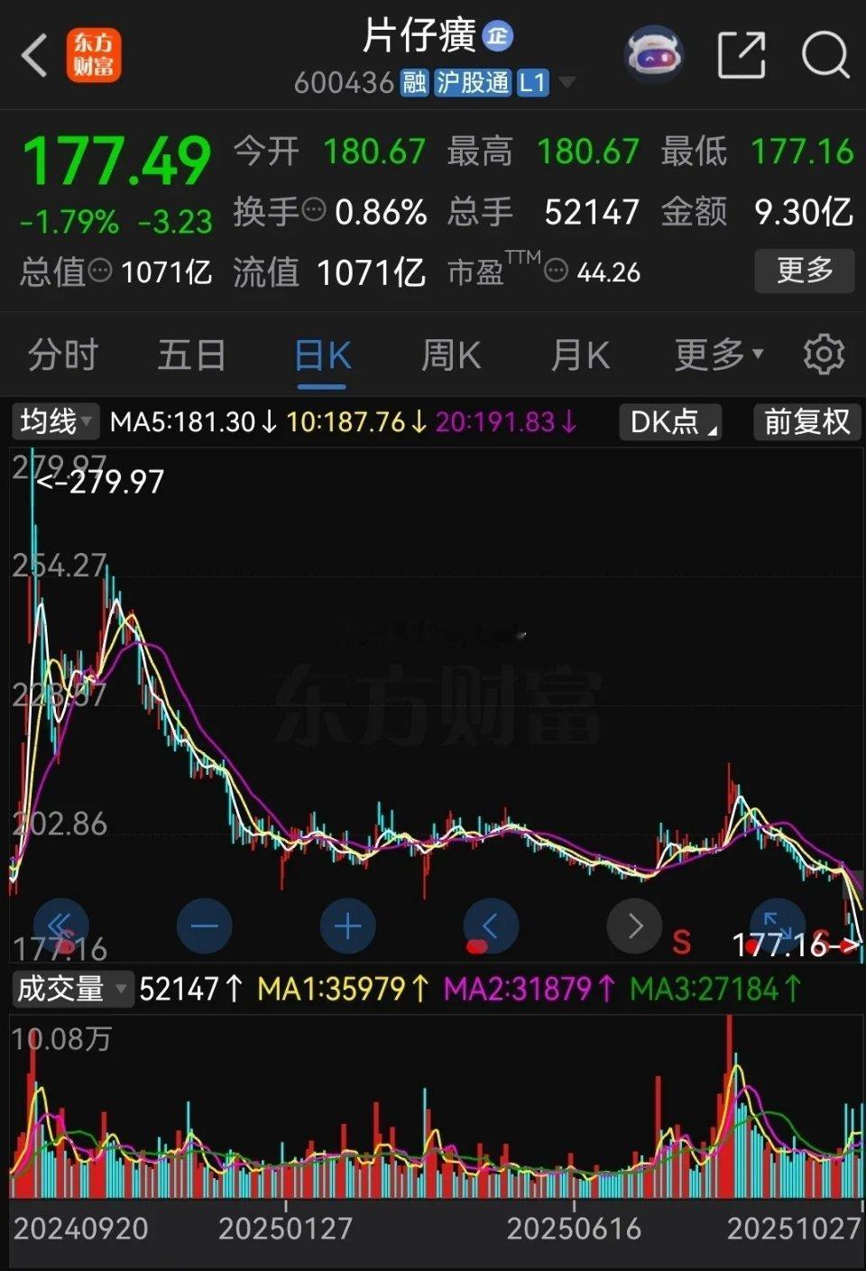 今天片仔癀开盘于180.67元,开盘价就是最高价,盘中一路下探,不断见新低,最低跌到了177.16元,不但创出了今年以来的新低,而且比去年大盘2600多点时,还要低。