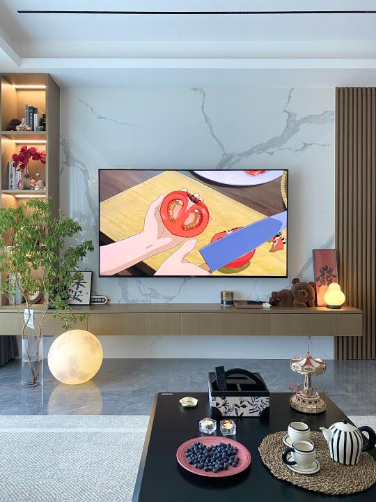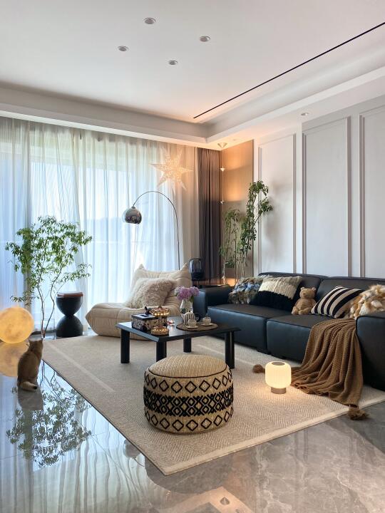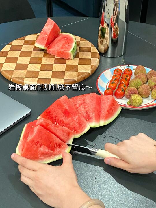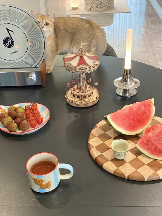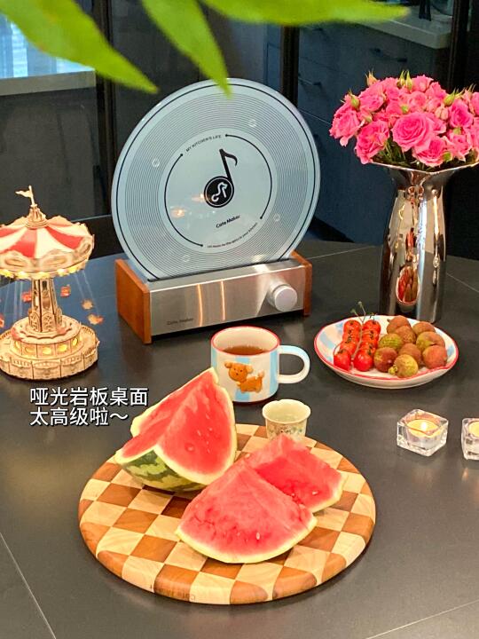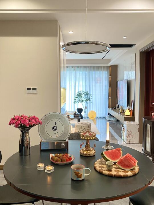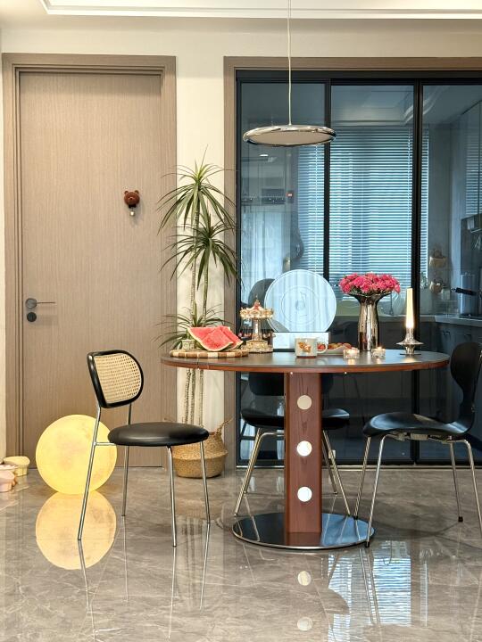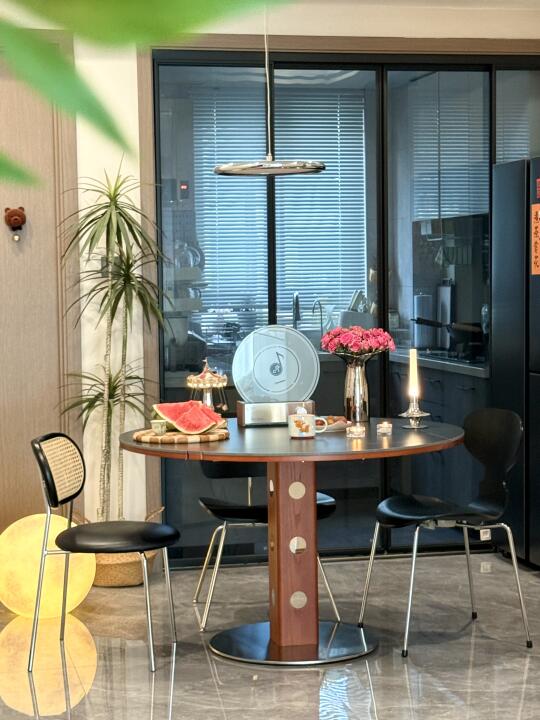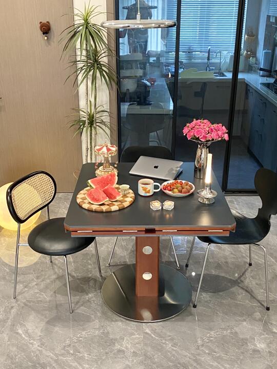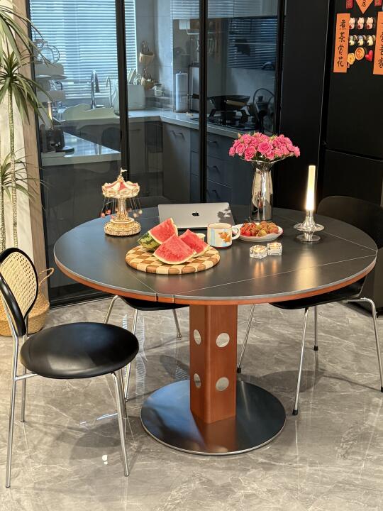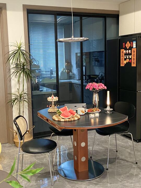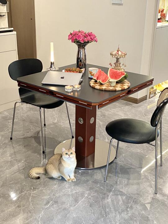 hi hi大家好,欢迎来到咩咩的小家~ 我家是套内100平的小户型,硬装简单,大多数心思花在软装上 精心布置以后的家越来越喜欢,和猫猫一起生活的日子真的很幸福!! . 我家餐厅大概8平米,餐边柜冰箱嵌入,释放厨房空间 放完餐边柜和冰箱以后餐厅就更小啦,一直纠结要摆放圆桌还是长桌,后来刷到木小咖这款两折叠圆桌,成年人真的不做选择,圆桌长桌我都要! . 这两折叠设计简直是小户型天菜! 日常用餐,折成窄长方桌靠墙摆,过道都宽敞不少🚶 朋友聚会、家庭聚餐时,轻轻一拉,秒变直径 1.2 米圆桌,6 - 8 人轻松坐下,氛围感直接拉满🥳 还能切换成扇形桌,咋变都超省空间~ 它是黑色哑光岩板拼接实木,简约又有格调🪑 岩板抗污能力一绝,脏了轻轻一擦就干净,还耐磨耐划,日常用超安心🧽 加粗金属支架搭配实木支撑腿,稳固得很,吃饭时一点不摇晃,腿部活动空间也够足~ 这两折叠圆桌,颜值和实用性双在线,小户型姐妹们,闭眼冲就完事儿~
