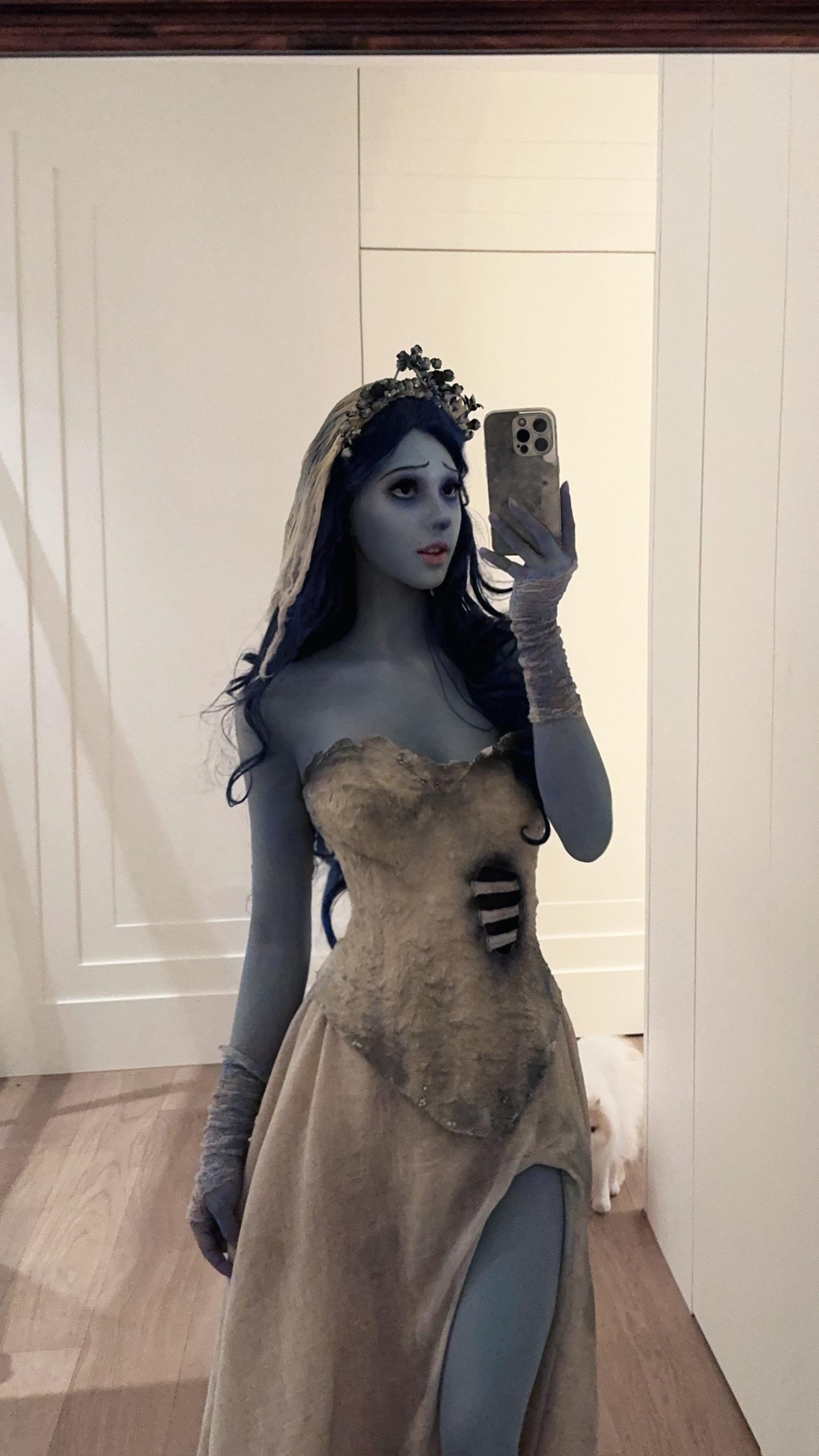 这位女士的穿搭展现了优雅与性感的完美平衡。她身着一件蓝色蕾丝拼接连衣裙,上半身采