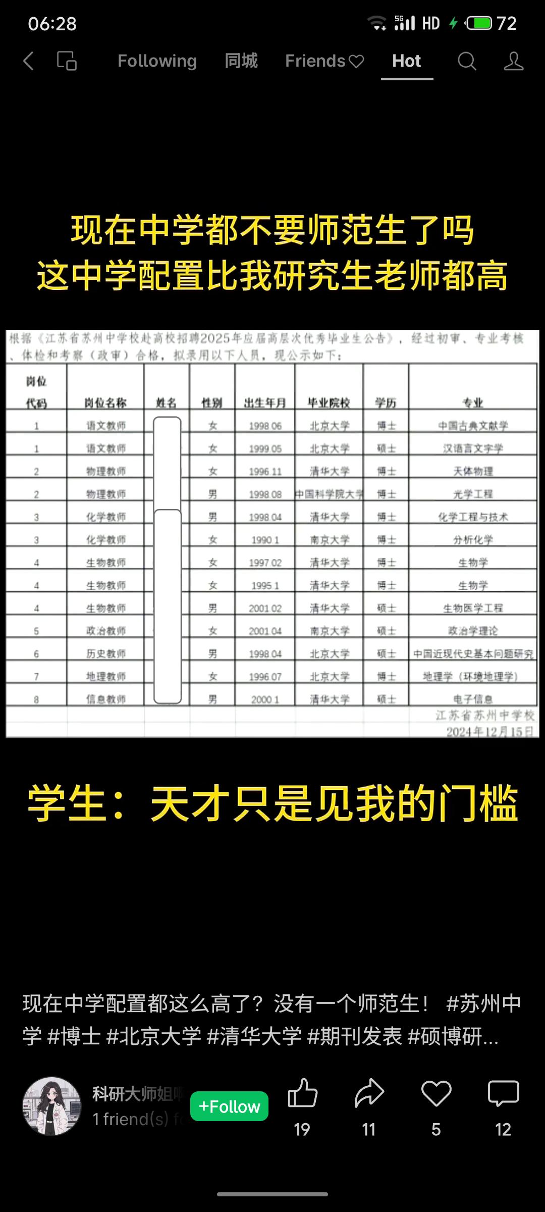 如今顶尖中学教师招聘日趋"高配"。苏州中学新聘教师清一色来自北大、清华的硕博毕业生,却无一人出身师范专业。这反映出名校对师资学历的高要求,但也引发对教师队伍多元化及教学实践能力的思考。高学历不等于教学能力,基础教育仍需兼顾学术水平与教育素养。