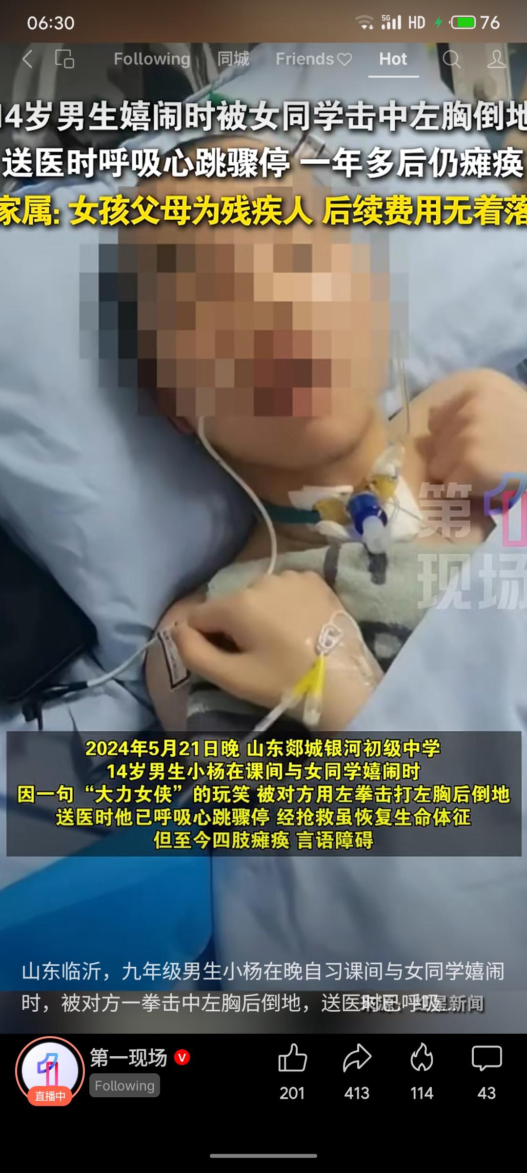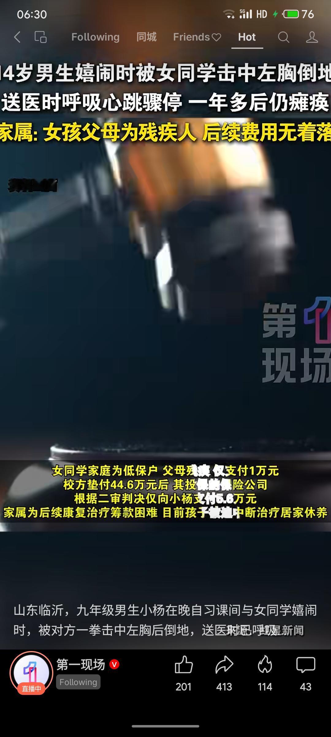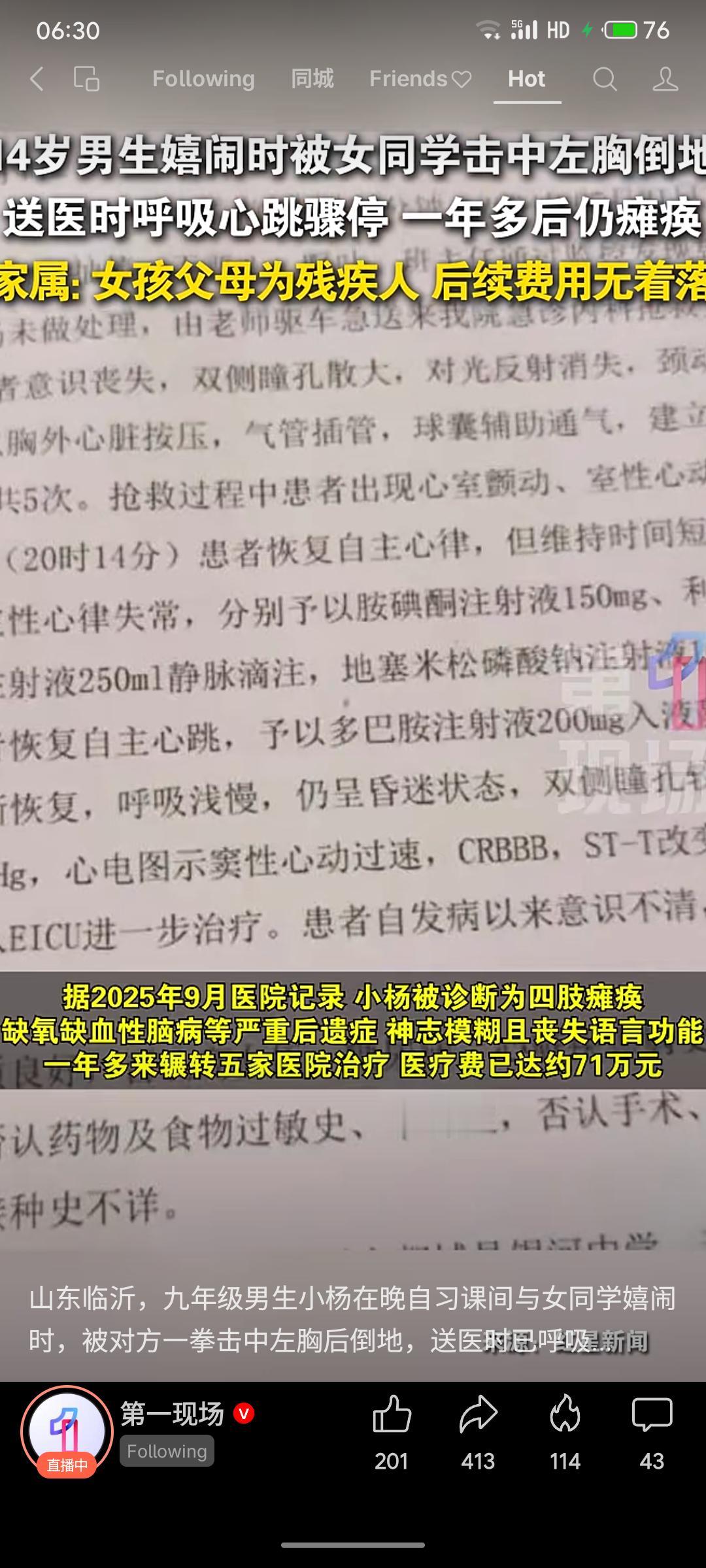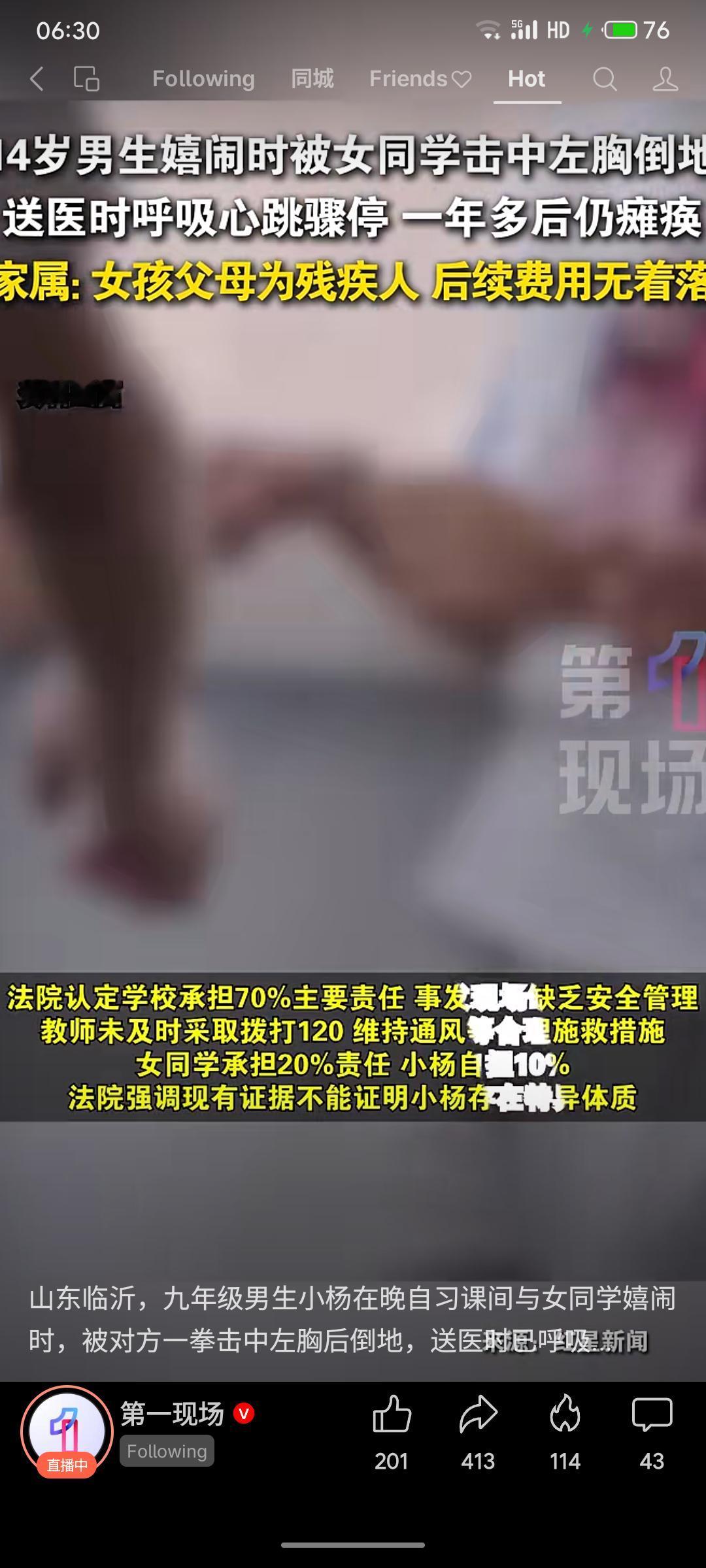 山东临沂一名14岁男生晚自习课间与女同学嬉闹,被对方一拳击中左胸后倒地,送医时呼吸心跳骤停。虽经抢救恢复生命体征,但至今四肢瘫痪、言语障碍。法院判决学校承担70%主要责任,女同学承担20%,男生自担10%。女同学家庭系低保户赔偿困难,校方保险赔付不足,家属面临后续治疗费用无着的困境。