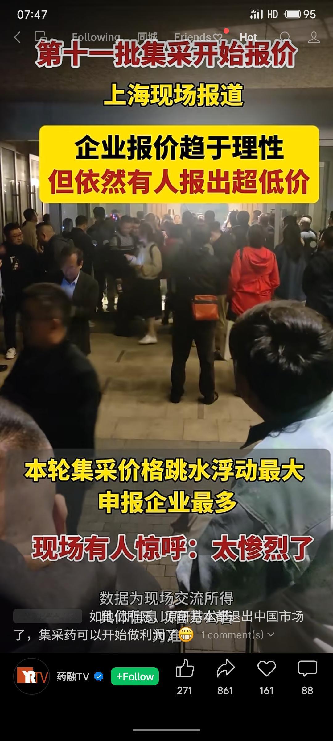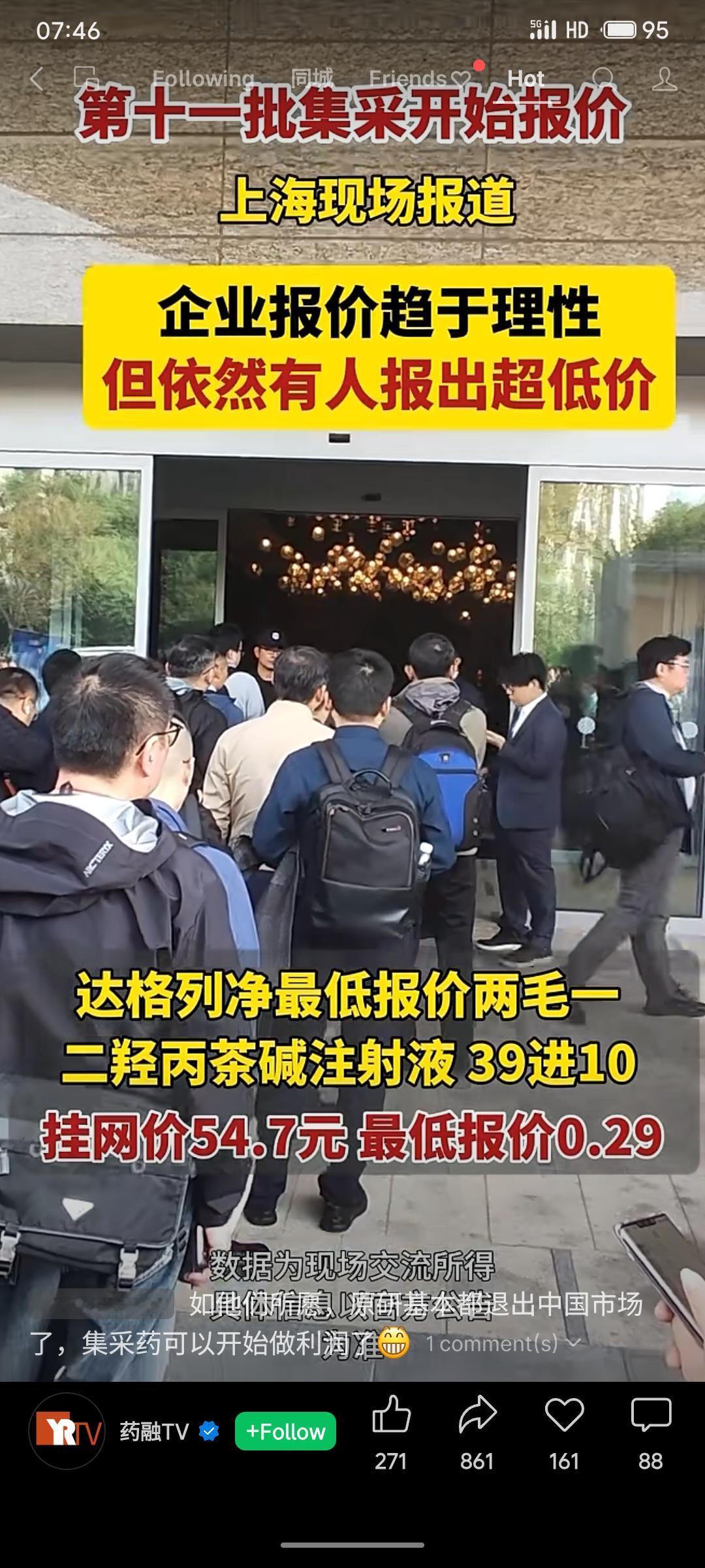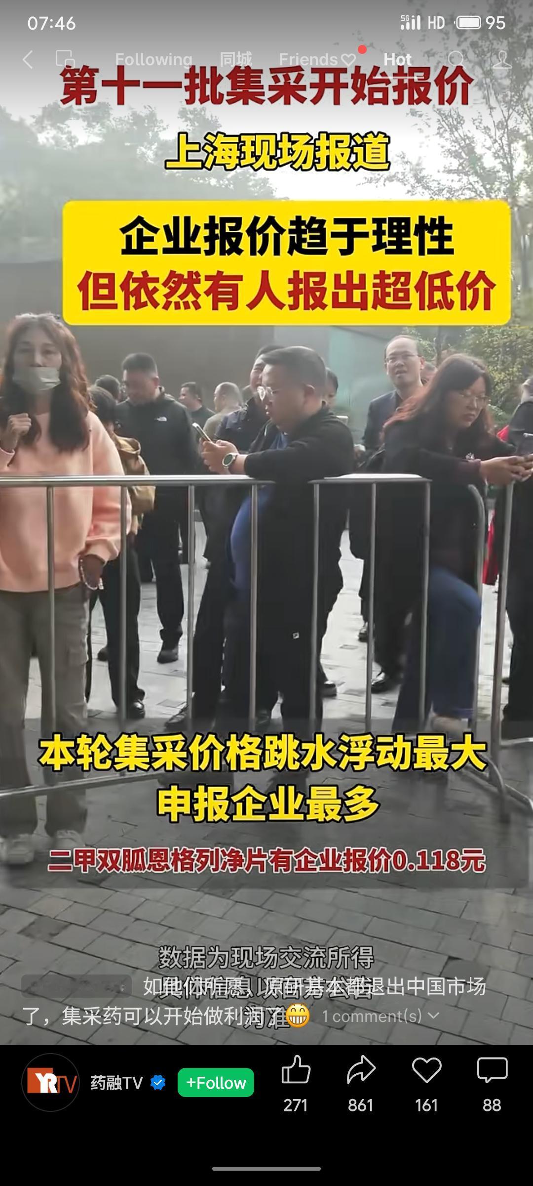 药品集采报价现场:企业报价趋于理性,但部分品种仍现超低价竞争。第十一批集采中二甲双胍恩格列净片低至0.118元,第十三批达格列净报出两毛一低价,多款药品价格大幅跳水,竞争激烈。