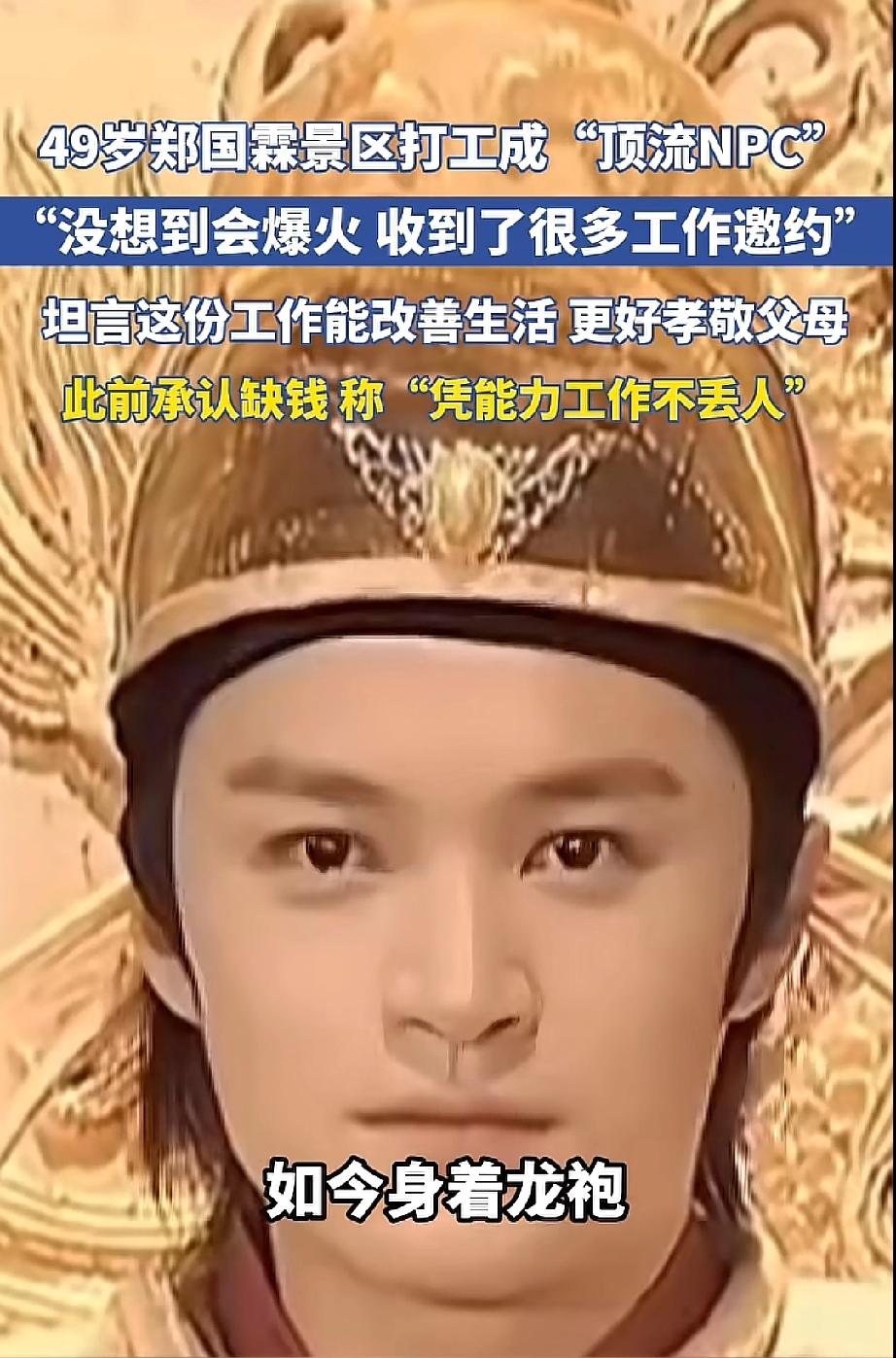 49岁郑国霖敢当众说“我缺钱”, 靠景区当NPC养家的坦诚,真的比圈里那些悬浮的完美人设戳人多了! 谁还记得他是当年的李世民、董永,可如今戏约减少,他不硬撑明星体面,顶着高温穿厚重龙袍和游客互动,坦言工作就是为了给父母换电梯房、添冬衣。 明星总被包装成不食人间烟火的样子,可郑国霖偏把中年人的压力和责任摆上台面,说“凭本事赚钱不丢人”,这种不装、不端的真实,才是最难得的人格魅力。 其实观众从来不反感明星谈钱,反感的是明明锦衣玉食却卖惨,或是身居高位却脱离现实。 郑国霖的走红,本质是大家对“真实”的偏爱——比起精心打造的人设,这种直面生活、踏实努力的模样,才更让人觉得温暖又有力量。 你觉得娱乐圈里这种“不装”的明星是不是越来越难得了?