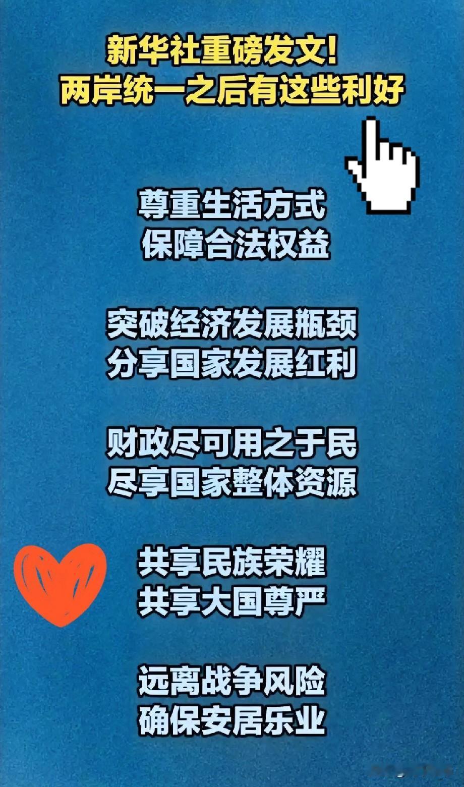 【台办最新喊话引爆关注!五大权益勾勒统一后幸福图景,台湾同胞这次心动了吗?】 一纸"家书"抵万金!昨晚,署名为"钟台文"的台办文章刷屏网络,用最直白的语言描绘了两岸统一后的美好蓝图。 这已经不是第一次喊话,但这次特别实在——五大权益条条戳中民心:生活方式不变、发展红利共享、财政用于民生、共担民族荣耀、远离战争阴影。据说文章发布后,岛内社交媒体讨论热度直线飙升。 最打动人的是那句"妈妈等你70多年了",这话说得让人鼻子发酸。想想也是,谁家孩子出门久了,当妈的不天天盼着回家?统一不是谁吃掉谁,而是让漂泊的孩子回到温暖大家庭。 其实老百姓要的很单纯——安居乐业、有尊严、有发展。这五大承诺正好说到了心坎上。有网友调侃:"这条件比相亲彩礼实在多了!" 微评: 抛开政治术语,这就是一场跨越海峡的亲情对话。当"家国情怀"遇上"实实在在的民生利好",和平统一的吸引力正在具象化。 互动时间: 如果你是台湾同胞,最期待统一后实现哪条承诺?欢迎在评论区说出你的心声! (文末小调查:你觉得"妈妈等你回家"这句话,能打动多少游子的心?)你认为年轻人在两岸统一中能起到什么作用