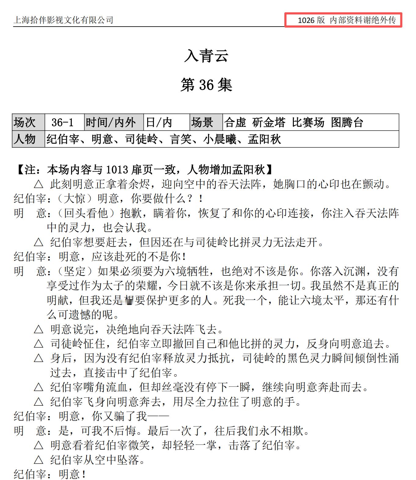 可以明显看出,最后吞天阵这场戏,在9月17号版的剧本(大概率是鸡丁写的初版本)里,是明意自己跳进的吞天阵,见到了蔺自遥。