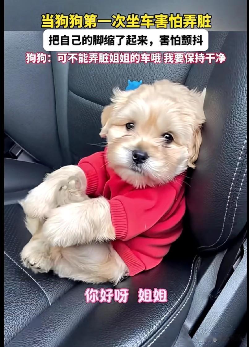 这只小狗太讲究卫生了。小狗第一次坐车,害怕把车弄脏了,把自己的脚缩了起来,用两只狗爪紧紧抱住狗腿,一直努力的保持着这种姿势,小狗爪都在颤抖着,小狗老老实实的靠在靠背上,不敢乱动。还一脸可怜巴巴的看着小姐姐。真是太可爱了!