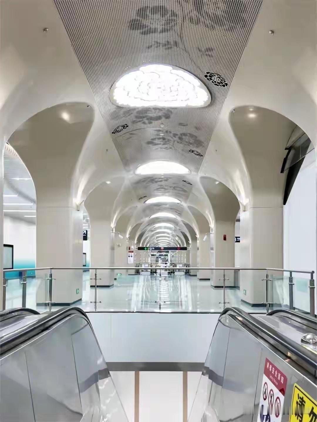 以芙蓉花、古城门、锦江为设计元素的地铁城,成都13号线新南门站,拱形结构设计的造型是成都地铁站独有的风格! 整体氛围简约现代而不失古典韵味! 天花板上芙蓉造型的花灯宛若点点繁星,两侧墙面青蓝渐变犹如锦江波光——这便是新南门站近日揭晓的室内景观。 连续的拱形结构让成都人唤起古城门的记忆! 有历史记载,这座3000千年至今未更名的古城就是以“芙蓉花”命名的花下锦官城”蓉城” 新南门又位于中心城区,所以新南门站以“芙蓉花”为主题特色设计的风格! 有趣的成都现所有的地铁站的站内设计,皆因站点不同的地理位置,以不同的要素而设计了不同的造型! 这样的设计构造,能让每一位乘客自踏入车站的那刻起,能感受到成都独有的气息! 所以,新南门站即是“芙蓉花下地铁城” 作为连接东西的轨道交通动脉,13号线一期的这个换乘枢纽将显著提升城市出行效率。 在便民设施方面也是设计到位的。 车站充分考虑大客流及不同人群需求,设置了卫生间、母婴室、儿童洗手台等设施, 以及26台电扶梯和2部无障碍电梯,方便携带大件行李的乘客通行。 同时,车站还引入了智慧化安检系统和票务系统,方便乘客高效便捷出行。这是当前其它车站未具备的理想条件, 因当前科技先进了,设计的想象力更丰富了,条件成熟了,经济实力提升了,布局也就更全面了!如今的乘客不仅是为了乘车的便捷,另外也在不断追求不同的视觉感受! 而这条线所有的设计符合每位乘客的需求,它在原有的基础上提升了一个档次! 而且13号线这条线是贯穿中心城区的一条,可见它在建设中的繁琐程度是我们这些人无法想象的,是丁丁点点不敢马虎认真对待的存在! 这样的精心筹备与布局,显然在整体工程的方量上面,无疑增加了诸多复杂繁琐的程序, 之所以熬这么几年,工程进度缓慢是有一定原因的。 它关系到小到每一颗螺丝钉、每一块地砖,大到每一台设备、每一个系统,都要进行反复精细地调试,确保以最佳状态迎接市民搭乘的安全。 从8月26日空载运行起足够两月了,至11月26日将圆满结束试运期, 这条串联西东的大动脉终于等到波动了,大家是不是特别欣喜? 真到开通的那一天,让我们站在“芙蓉花”下好好体验一番设计新颖新南门站吧?