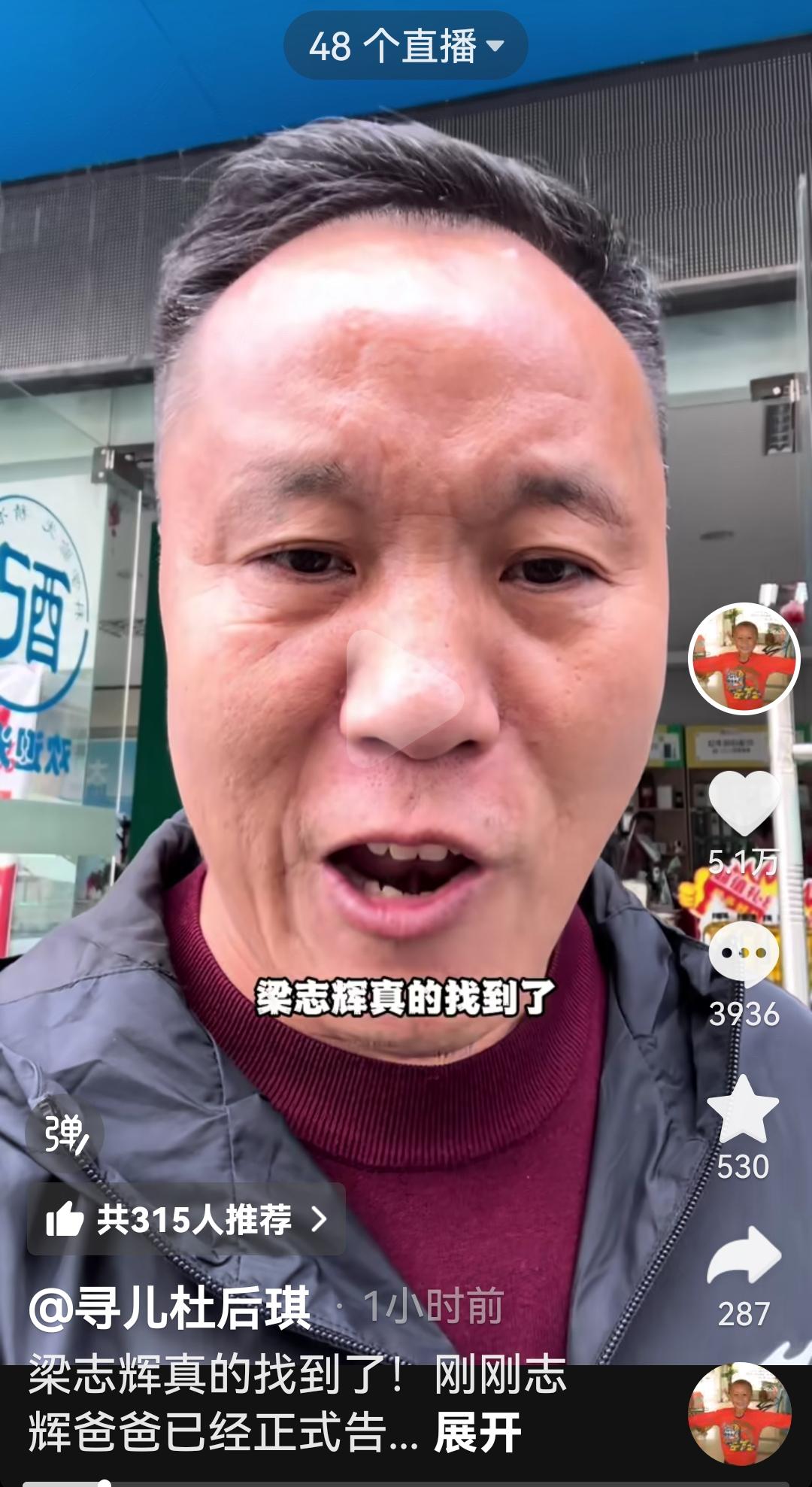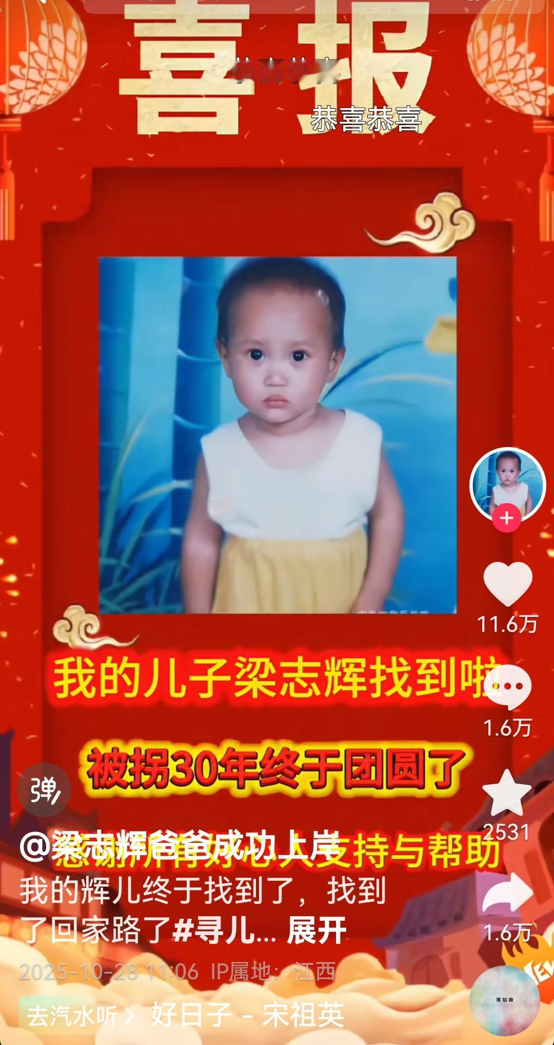 小米奇爸爸说,梁志辉找到了 也就是寻找被拐孩子的家庭又找到自己孩子了 自从孙海洋寻找儿子孙卓之后,看到很多被拐孩子都找到自己亲生父母 说明这几年社会上的力量都在帮忙,每个家庭也都努力,让被拐的孩子,找到自己亲生父母 据说梁志辉养父母在深圳,家庭也不错 只要孩子好好成长就是最好的 愿天下无拐! 梁志辉 梁志辉妈妈 寻亲小孩 孙海洋带货翻车 图片来自网络截图