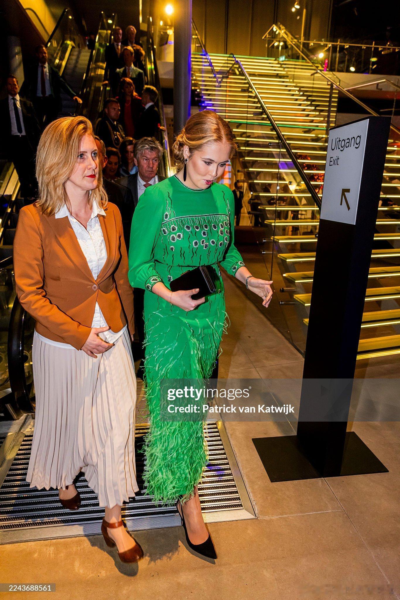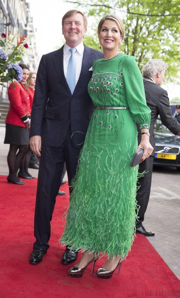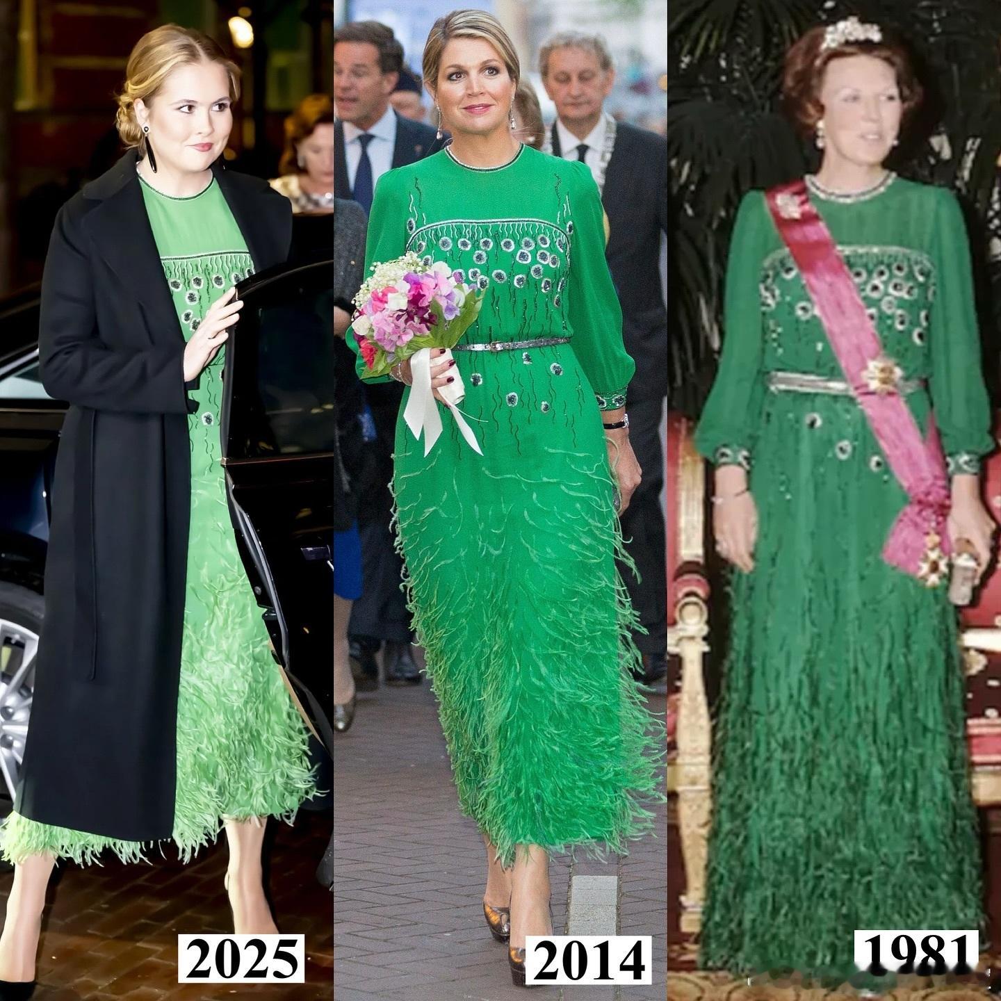 你究竟有多爱这件衣服 昨晚荷兰女王储凯瑟琳娜·阿玛丽亚出席阿姆斯特丹建成750周年全国庆典时,身穿的Theresia Vreugdenhil定制深绿色孔雀礼服(裙摆的毛毛是鸵鸟毛材质)可追溯至祖母碧翠丝(图2),碧翠丝曾在1981年国事访问比利时的晚宴中穿着出镜,玛克西玛接过这条礼服后,把礼服的裙摆裁短,2014年,玛克西玛穿着它出席当年的荷兰解放日音乐会,之后又放了十几年,直到凯瑟琳娜·阿玛丽亚第三次穿着。