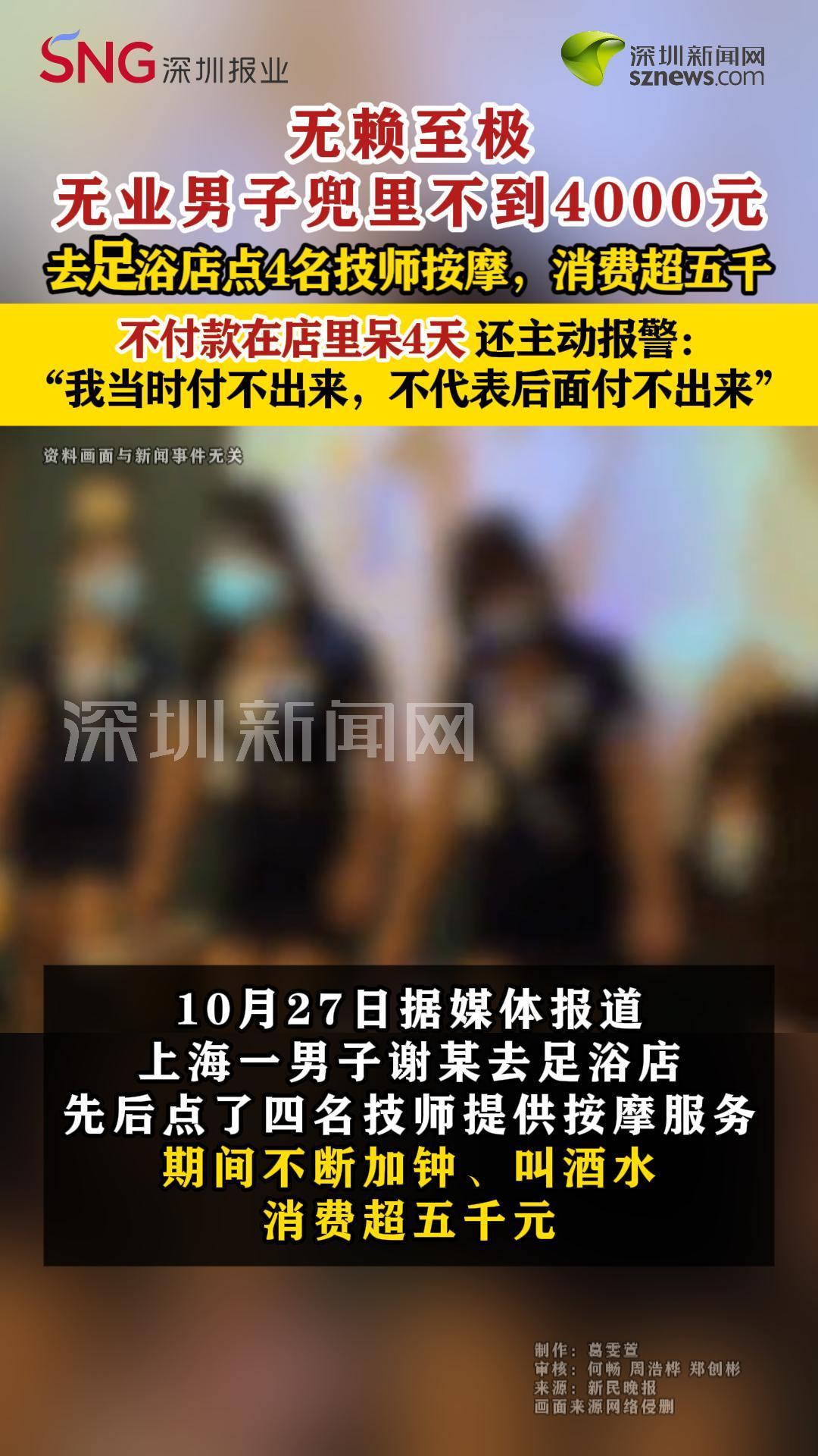 “厚颜无耻!”无业男子兜里不到4000元,去足浴店点4名技师不付钱,10月27日据媒体报道,上海男子谢某去足浴店,先后点了四名技师提供按摩服务,期间不断加钟、叫酒水,消费超五千元。最终等待他的是两年有期徒刑。 2025 年 4 月 26 日晚八点,松江区那家开了五年的足浴店刚上客,谢某就推门进来了。他穿件翻领夹克,袖口磨得发亮却熨得平整,一开口就透着股 “不差钱” 的派头:“先来两个精油开背,再加两个足底,都要最好的技师。” 前台见他谈吐爽快,没提先付押金的事 —— 这是行业惯例,大额消费通常服务后结账,全靠顾客自觉。 技师们很快发现这位客人 “需求旺盛”。第一个小时刚过,谢某就招手加钟,指定要 “加强版肩颈疏通”;半夜十二点又要了两瓶威士忌和四罐功能饮料,凌晨三点索性把四张按摩床拼在一起,让技师轮着服务,自己窝在中间刷手机。直到次日清晨六点,窗外天泛白,他才摆手让技师停下,桌上的空酒瓶堆了七八个,账单显示器上的数字定格在 5280 元。 店长拿着账单上前时,谢某的态度来了个 180 度大转弯。他摸出手机划了半天,眉头皱成疙瘩:“银行卡冻结了,等我朋友转钱过来。” 店长留了个心眼,让他联系朋友,他却借口信号不好躲进卫生间,出来时说 “天亮就到账”,往沙发上一躺就不肯动了。 这一躺就是四天,他把店里当成了免费旅馆,渴了拿吧台的矿泉水,饿了点外卖直接送到前台,晚上就蜷在沙发上睡觉,客人进来时还得绕着他走。 第四天下午,店长实在忍无可忍,带着三名员工围上去催款。谢某却梗着脖子喊:“急什么?我工程款下周就到!先赊着不行?” 被明确拒绝后,他反倒掏出手机拨通 110,语气委屈得像受了欺负:“警察同志快来,他们强迫消费还不让我走!” 民警到场后刚一调解就觉出不对劲。系统显示,几天前谢某就在另一家足浴店因无力结账报警,当时双方协商了还款日期,显然是故技重施。进一步调查揭开了更惊人的真相:谢某 3 月来上海后就没找过工作,属于无业状态,名下存款加现金总共不到四千块,根本没有消费能力。 更耐人寻味的是他手机里的搜索记录,“顾客不给钱多少可以立案”“霸王餐报警有用吗” 这类词条赫然在列,显然是早有预谋。 从 4 月初到案发,他已经在三家足浴店用同样手段恶意消费,每次都专挑先服务后结账的场所,用 “工程款快到账”“朋友马上转钱” 等借口拖延,累计欠下的费用超过两万元。有店家回忆,谢某每次都表现得很大方,一点看不出缺钱的样子,等到结账时才露出真面目。 9 月 1 日,检察院依法对其提起公诉,9 月 15 日,法院作出一审判决,以寻衅滋事罪判处谢某有期徒刑两年。法官在审理时提到,这类行为并非简单的民事纠纷,其反复作案、故意扰乱秩序的行为,已经触犯刑法,必须依法惩处。 谢某直到宣判都没完全想明白,自己不过是 “想潇洒几天”,怎么就成了犯罪。他不知道的是,上海近年已明确将这种恶意消费、拖欠费用并扰乱经营秩序的行为纳入重点整治范围,专门打击这类钻服务业流程空子的不法分子。 对此,你们有什么看法,欢迎评论留言~