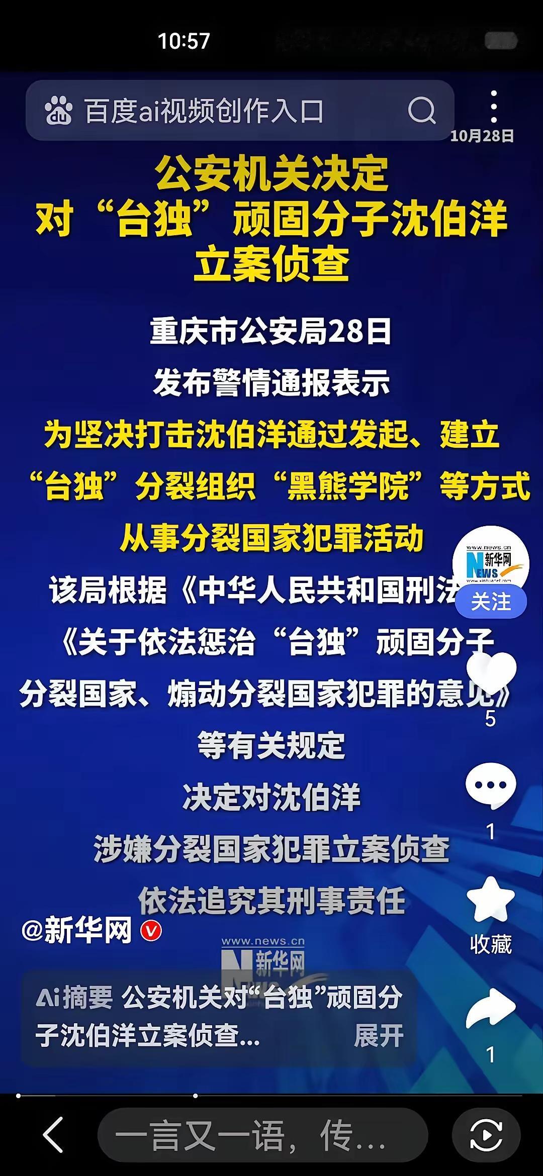 台顽分子沈伯洋被查,大陆这次真出手了就不再手软! 台独分子该慌了。 沈伯洋发起,建立“台独”分裂组织,“黑熊学院”等方式,长期从事分裂国家的犯罪活动, 公安机关依据《关于依法惩治“台独”顽固分子妄图分裂国家、煽动分裂国家罪的意见》对其进行立案侦查。 今天上午,国台办发布了将由重庆市公安局对“台独”顽固分子沈伯洋进行立案侦查的通告, 这是个大快人心的好消息一看到就拍手叫绝! 同时,也在变换方式地在警告岛内那些台独分子,企图分裂祖国的妄想别想得逞,台独只有死路一条! 反对台独分裂,维护国家统一,维护国家法律将是正义之举! 台独分子别以为有外部势力支持,就可以抱“侥幸心理”之态度继续搞对抗。 长期以来,岛内“台独”顽固分子活动猖獗,台当局及其台独掌控的绿媒、一贯违背历史和法理事实,一度狂妄叫嚣认为是鞭长莫及无权过问, 他们不知自己的迷之自信是大错特错多么的幼稚! “台独分裂势力自以为有外部势力的支持,来欺骗岛内民众,笃定了大陆对他们分裂国家肆无忌惮地之行为是鞭长莫及。 这种自欺欺人的言行是十分危险的错觉。 台湾曾经是联合国一百多个国家共同承认过的中国的一个省而已,这是“毋容置疑”的事实 ! 中国大陆对台进行司法管辖那是天经地义的事。 压根就不是用“鞭长莫及”来看待事实的? 大陆不在任由台独忽视国家法律了! 岂能容忍一群顽固分子将台湾从大陆版图上切割开? 上半年大陆将沈伯洋老爸在大陆经营的公司给查封了? 在依法治独父方面,大陆已出台了一系列措施,并且采取了具体惩独行动, 包括宣布“台独”顽固分子清单,通缉“台独”顽固分子等等。 沈伯洋应该知道跟大陆对抗,继续搞分裂是行不通的事, 就该明白顽固不化的后果,应该有所收敛还在肆无忌惮地搞台独? 台独猖狂之行为岂能容忍? 明确告诉台独分子,实施统一方案已到关键时刻,若仍不转变态度每狂妄一次,咱们惩治的圈圈就会套紧一扣、直到收紧动弹不得为止! 让台独顽固分子沈伯洋为自己“煽动分裂国家罪”将付出应有的代价才算理所应当!