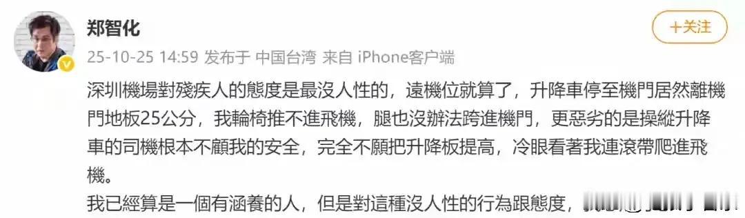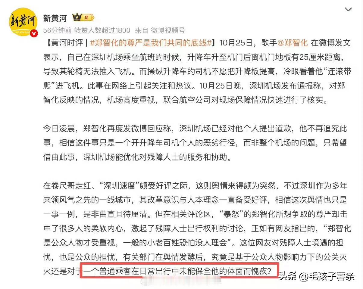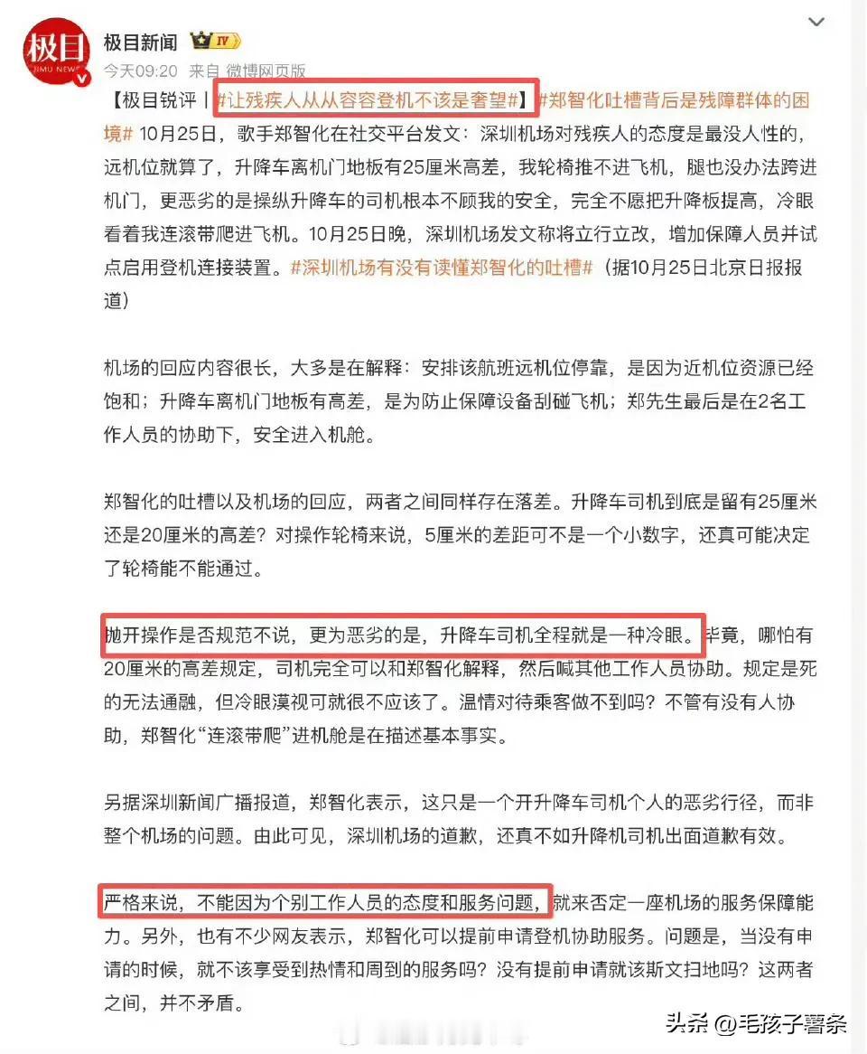 这两天冷眼看着他演,一出又一出,终于演砸了,最好以后不要来了,因为他不仅身残心也残。 先说深圳机场没人性,又说他连滚带爬进机舱,紧接着深圳机场回应并道歉,郑智化选择原谅,几家媒体站出来纷纷指责国内机场的服务,义正言辞,毫不留情。 视频一出,网友们开始质疑郑智化,明明是工作人员耐心细致的工作,郑智化是在工作人员的搀扶下走进机舱,怎么就叫连滚带爬了? 工作人员低头弯腰扶着他的两只脚迈进机场,空姐伸出双手搀扶,四个人为他服务,这叫没人性? 现在郑智化道歉了,那几家指责深圳机场的媒体怎么没了动静?
