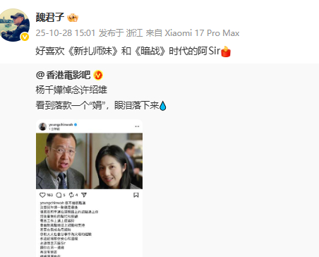 何超仪ins悼念许绍雄何超仪发文悼念许绍雄 10月28日,香港资深男演员许绍雄去