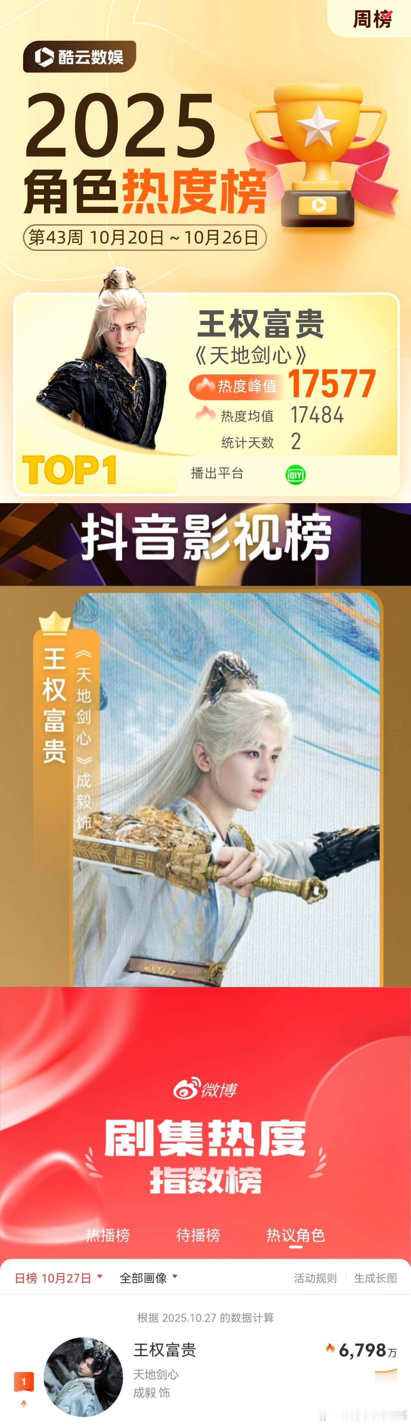 恭喜,成毅《天下剑心》不仅开播首日热度破平台五年来最高纪录,次日霸榜电视剧热度和角色热度第一,酷云角色热度第一,抖角色热度第一,V榜第一[666]角色榜已经各榜单登顶,人气牛批!
