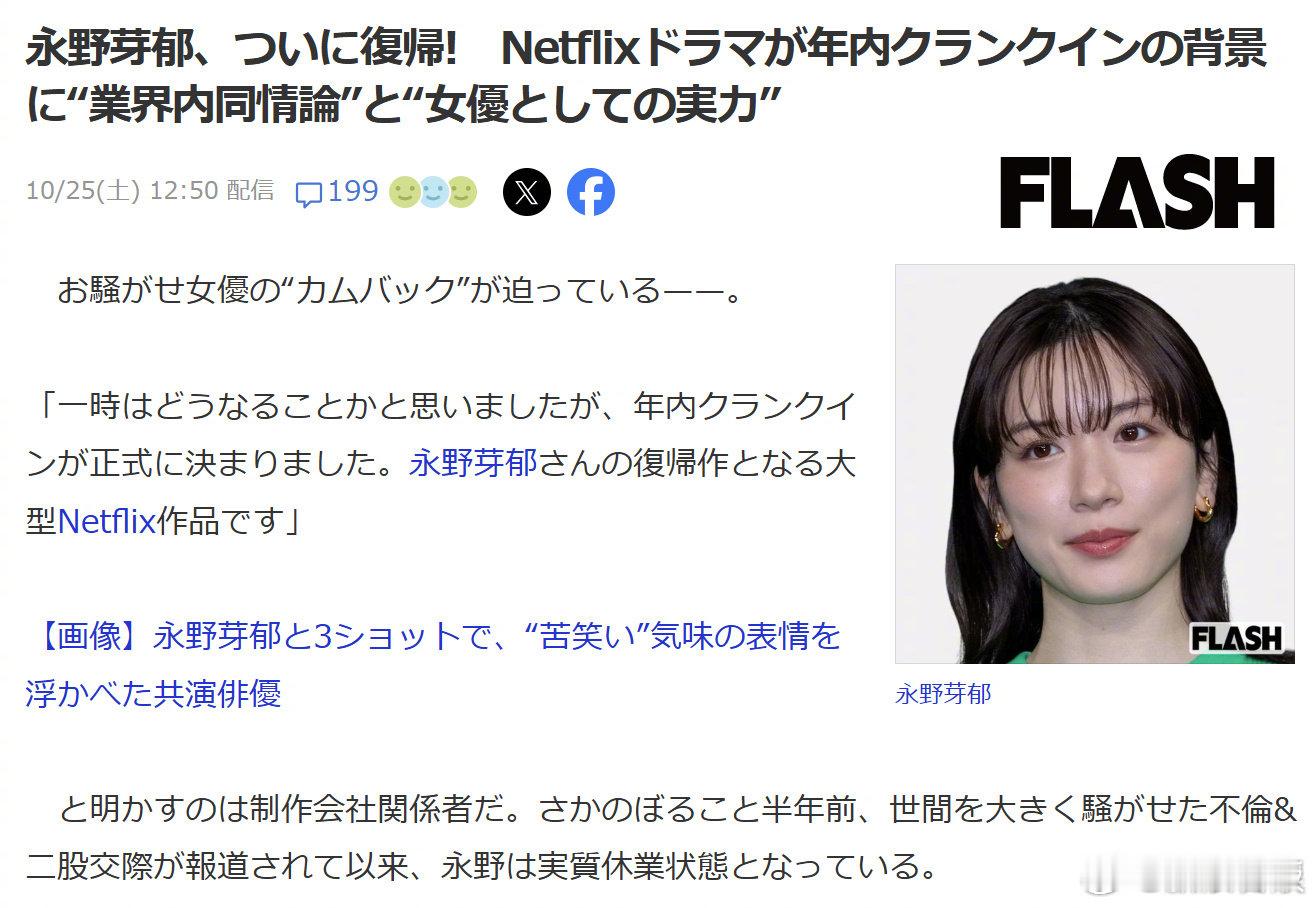 永野芽郁复出据日媒,出轨风波后,永野芽郁将通过小林启一执导的网剧剧集复出,颠覆