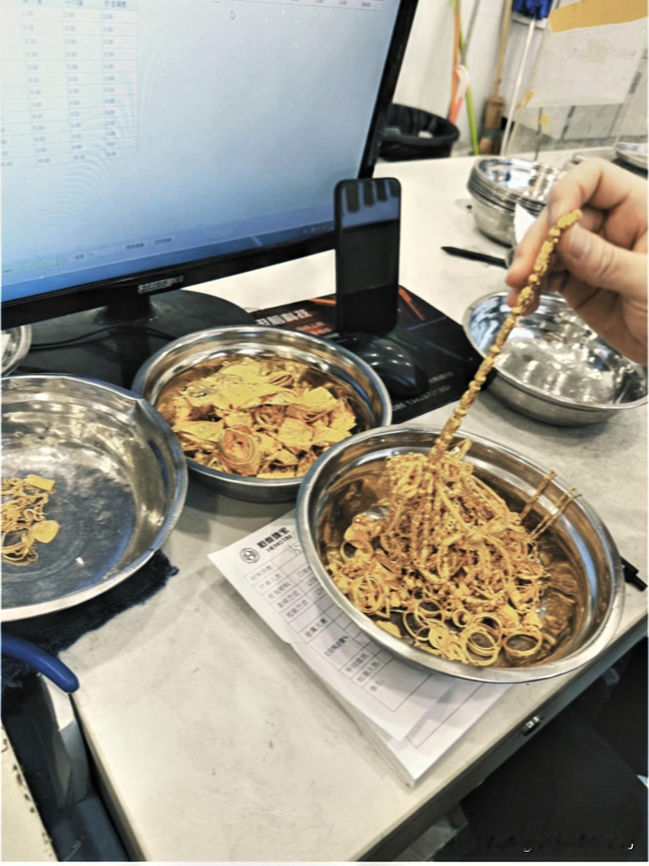 先给你把金烧一下,然后放进一个瓷杯里浸一下,一层金皮给剥掉了,几百块到手了!(杯里装着王水专门融金的)