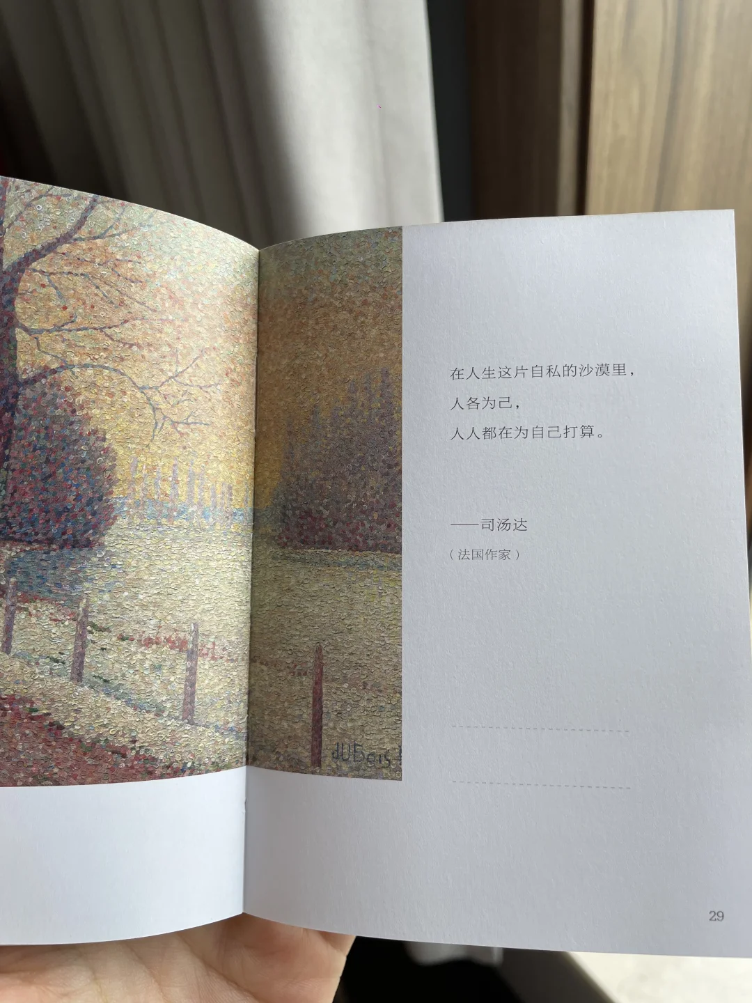 📗书名:《当星辰洒在向日葵花瓣上》 ✍️作者:尘驹 · 最近挖到一本宝藏掌心书 简直是为都市“卷心菜”量身定做的精神快充宝典!✨ 🚇通勤地铁上翻一页,加班间隙瞄一眼,睡前随手读一句,像吃下一颗颗“思维巧克力”,苦涩后回甘,越嚼越清醒 · 🌌 当哲学遇见名画,灵魂突然被击中 “人必须摔倒,才能抵达巅峰”,突然读懂:那些让我崩溃的跌倒,原来是通往星辰的阶梯 · ❤️书里藏着尼采、黑塞、梭罗的智慧碎片,但不说教!每句话都像朋友深夜发来的微信:短,但够你盯着天花板想半宿 · 🌟诞生就是入口 🌟死亡就是出口 🌟生命就是尘埃海洋中的一座小岛 · — • 掌心大小,塞进包包像带了个移动美术馆 • 金句+名画CP,1分钟get哲学与艺术的双倍治愈 • 无顺序压力,从哪页翻开都是恰到好处的启发 · ✅最后分享书中让我戒掉“过度思考”的一句: 👉生活的意义在于生活本身,而不在于你如何去描写 · 那些熬夜做的PPT 焦虑刷的短视频 勉强维持的社交 突然像被哲学X光扫过—— 原来我一直在用"假装思考"代替真实活着 · ✏️现在每天通勤读两页 像给大脑做一次深度SPA 终于懂了什么叫: "真正的清醒,是知道自己不需要一直清醒"
