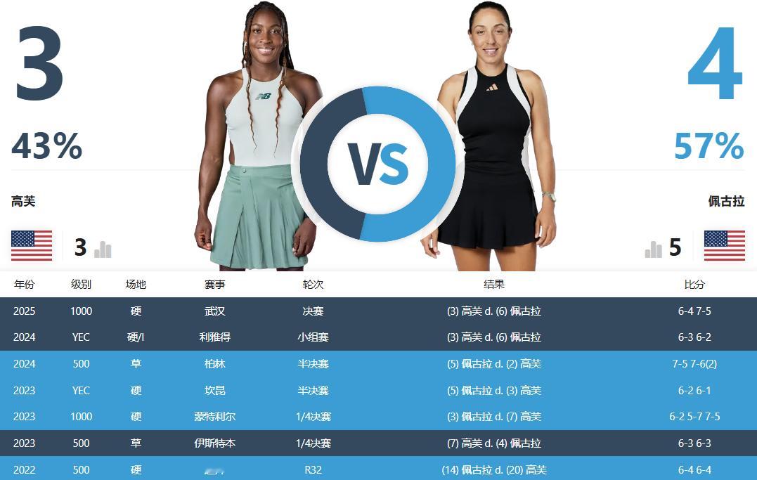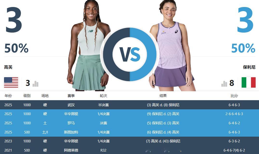 高芙:6-5萨巴伦卡、3-4佩古拉、3-3保利尼