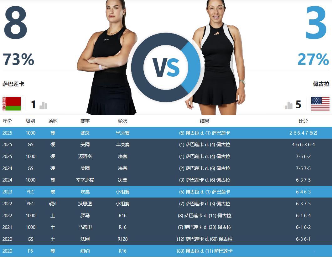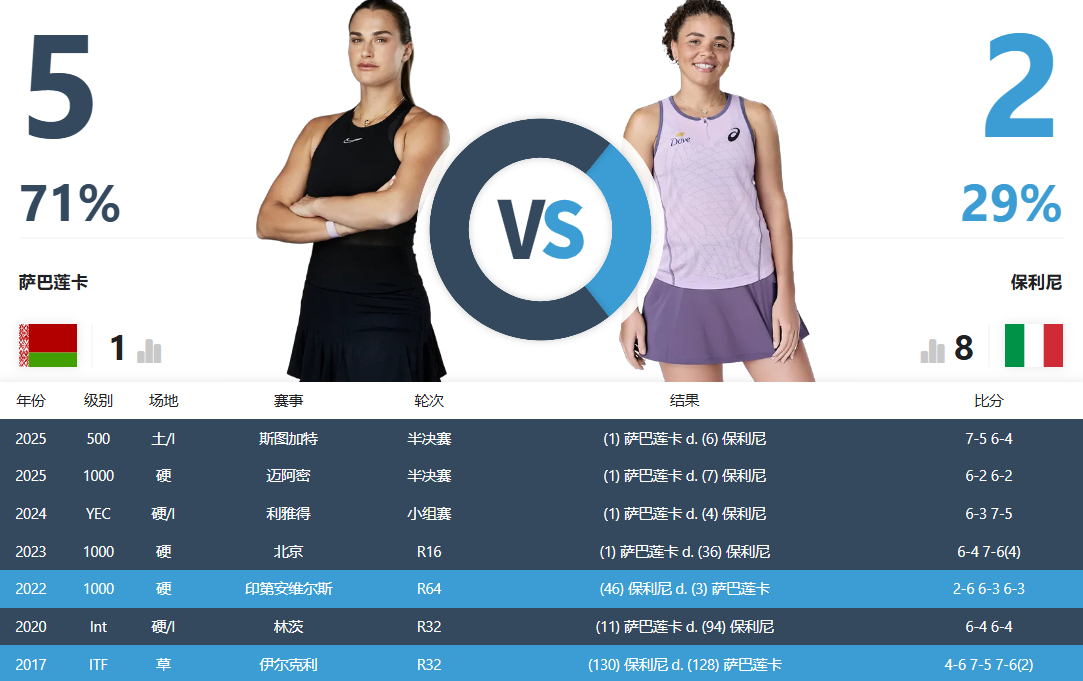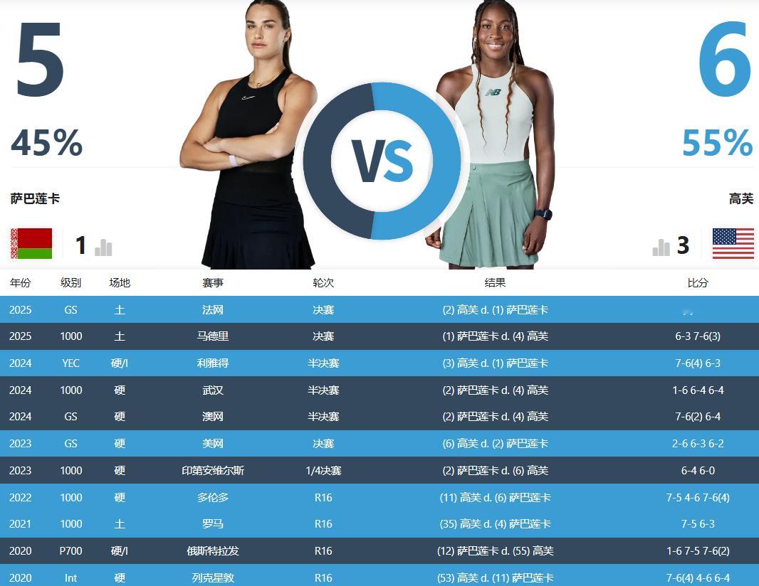 萨巴伦卡:5-6高芙、8-3佩古拉、5-2保利尼