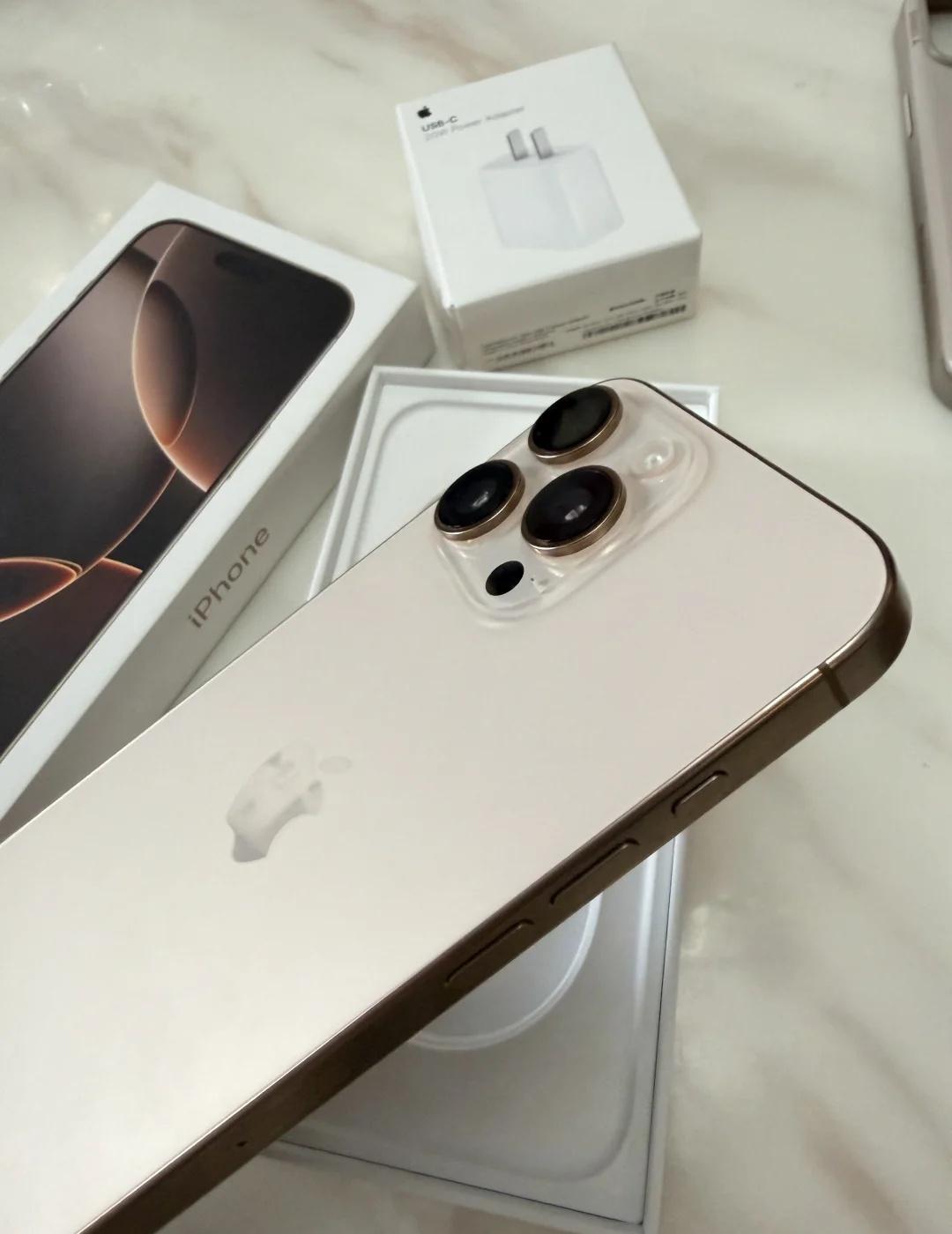 出一台女生自用iPhone 16 Pro Max 512G 沙漠钛色,一直贴膜带壳使用,成色和新的一样,保护得特别好! 京东自营购入,带所有凭证、原包装盒和全套配件、支持验货,走平台! 手机成色真的超级新,换手机了所以出,电池94%,在保,25年12月28号,送膜送手机壳➕一个原装充电头,也特别新!!! 7999,可以小刀,不支持屠龙刀!!!你爽快我也爽快iphone16promax 二手 闲鱼
