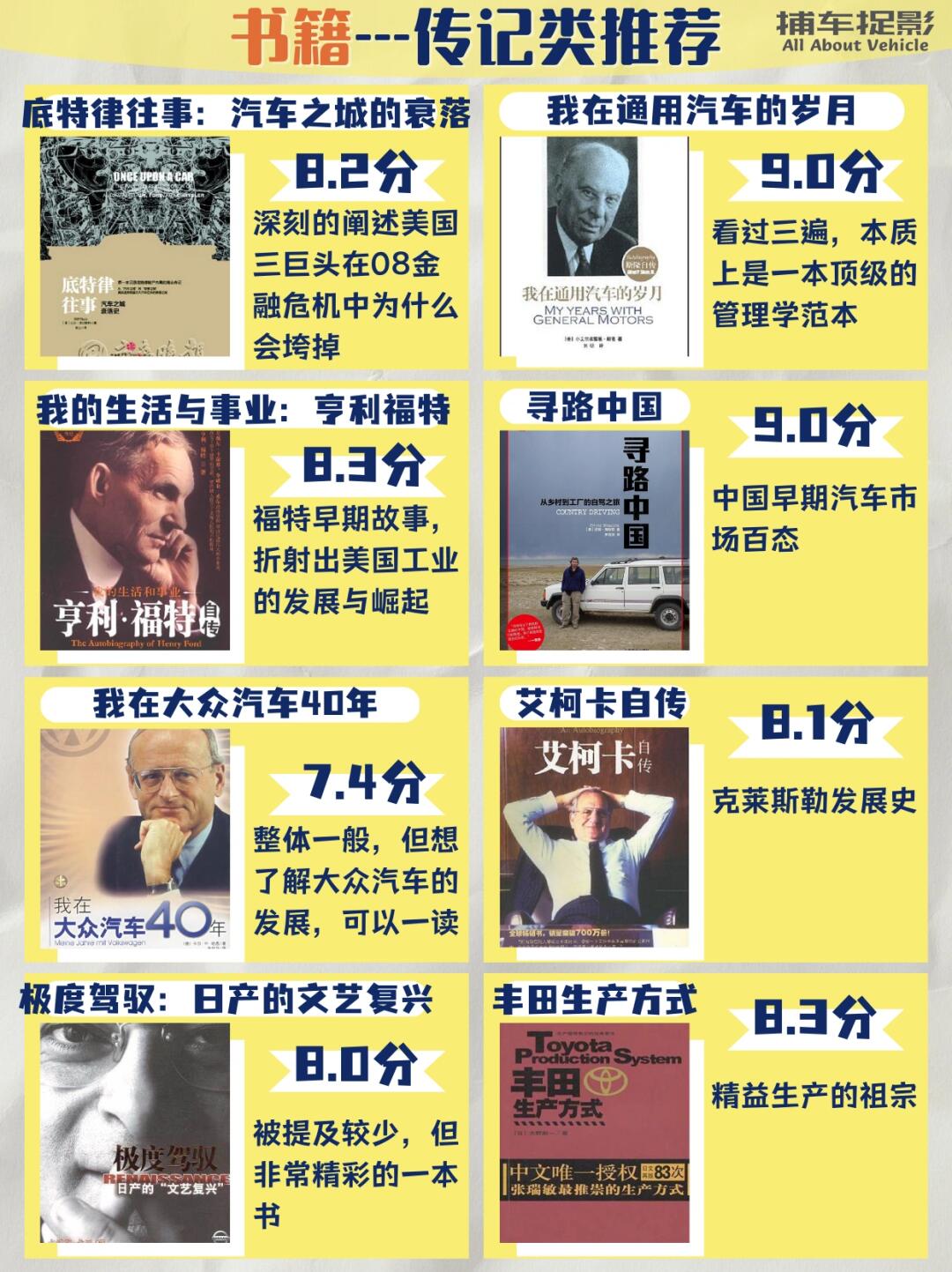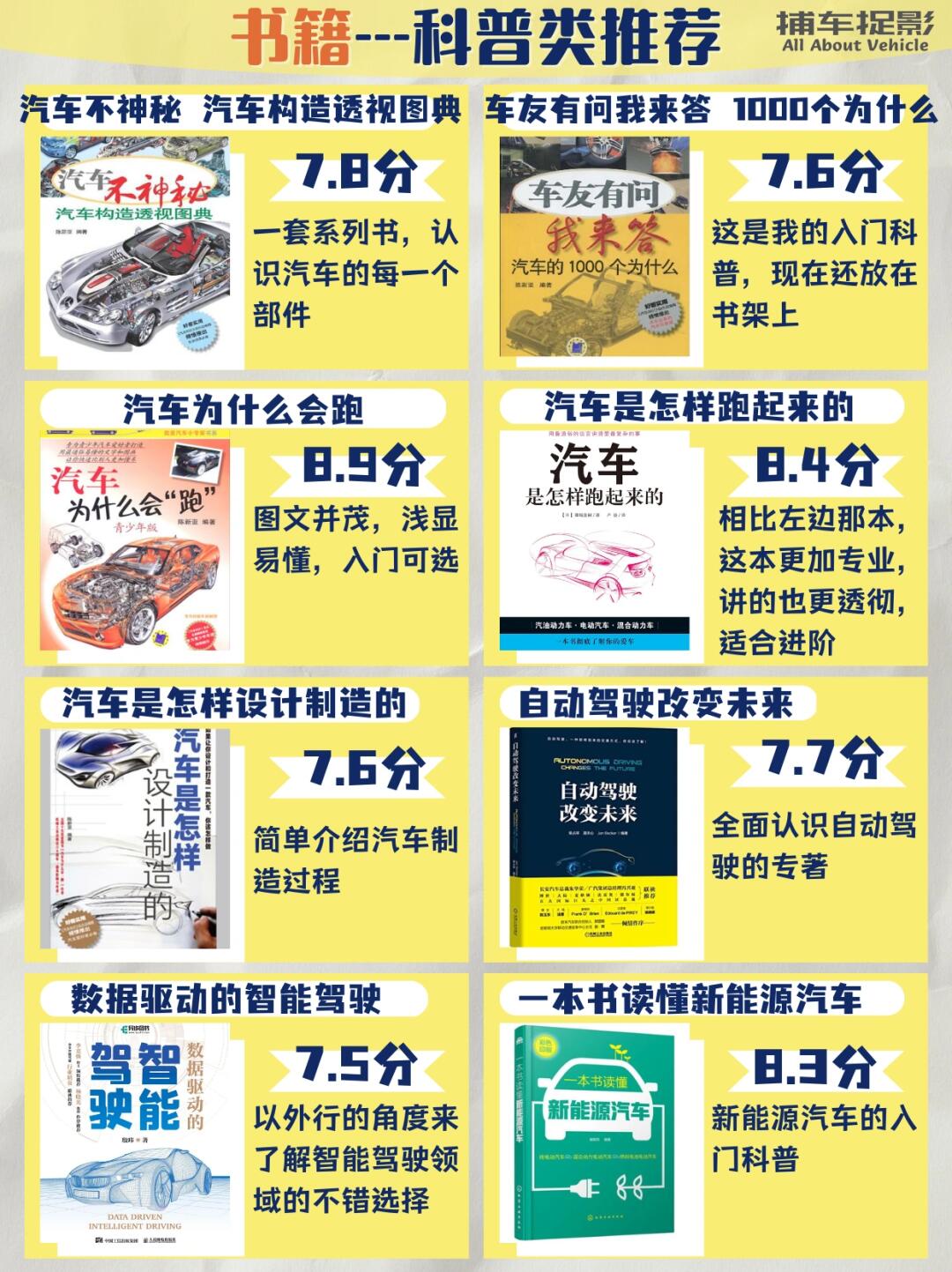 🚗🚗🚗🚗这篇不是面向汽车专业从业者的,所以我也没有推荐偏技术类的经典专业书籍和影视,以免过于晦涩难懂,看不下去🚗🚗🚗🚗