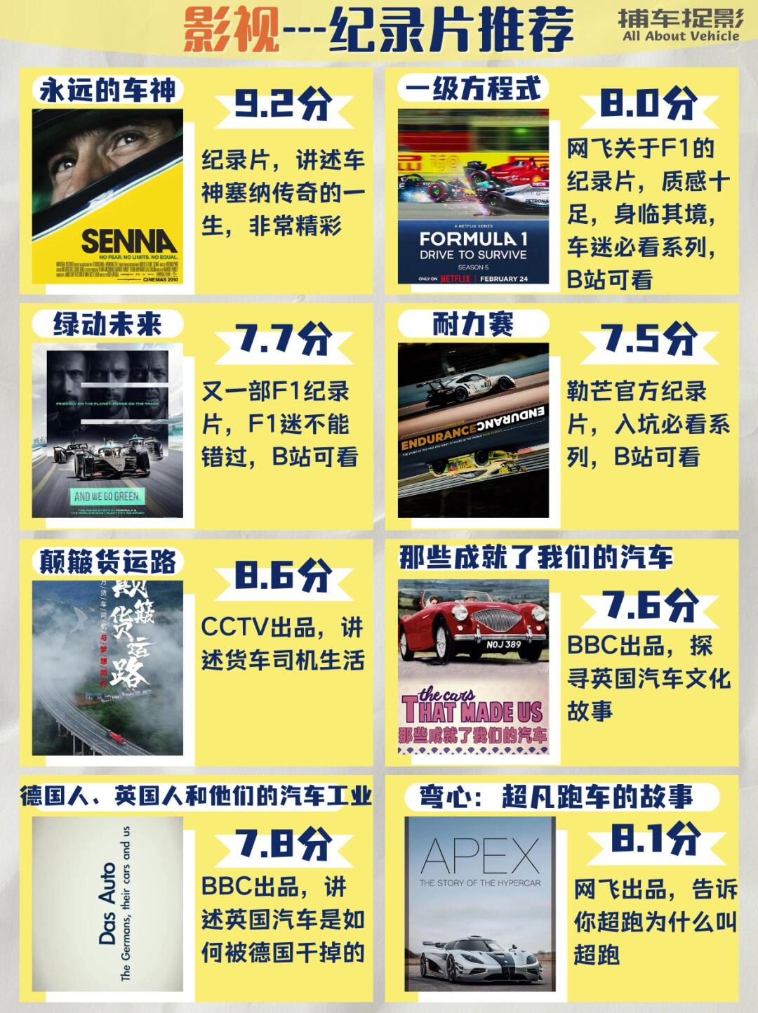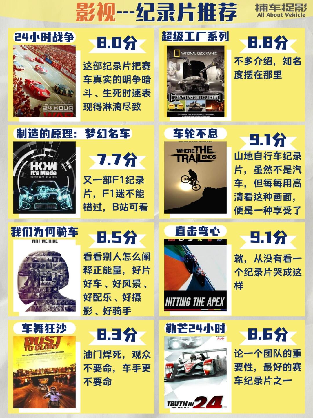《永远的车神》《一级方程式》《绿动未来》《耐力赛》《颠簸货运路》《那些成就了我们的汽车》《德国人、英国人和他们的汽车工业》《弯心:超凡跑车的故事》《24小时战争》《国家地理-超级工厂系列》《how it’s made dream cars》《耐力赛》《制造的原理:梦幻名车》《车轮不息》《我们为何骑车》《直击弯心》《车舞狂沙》《勒芒24小时》