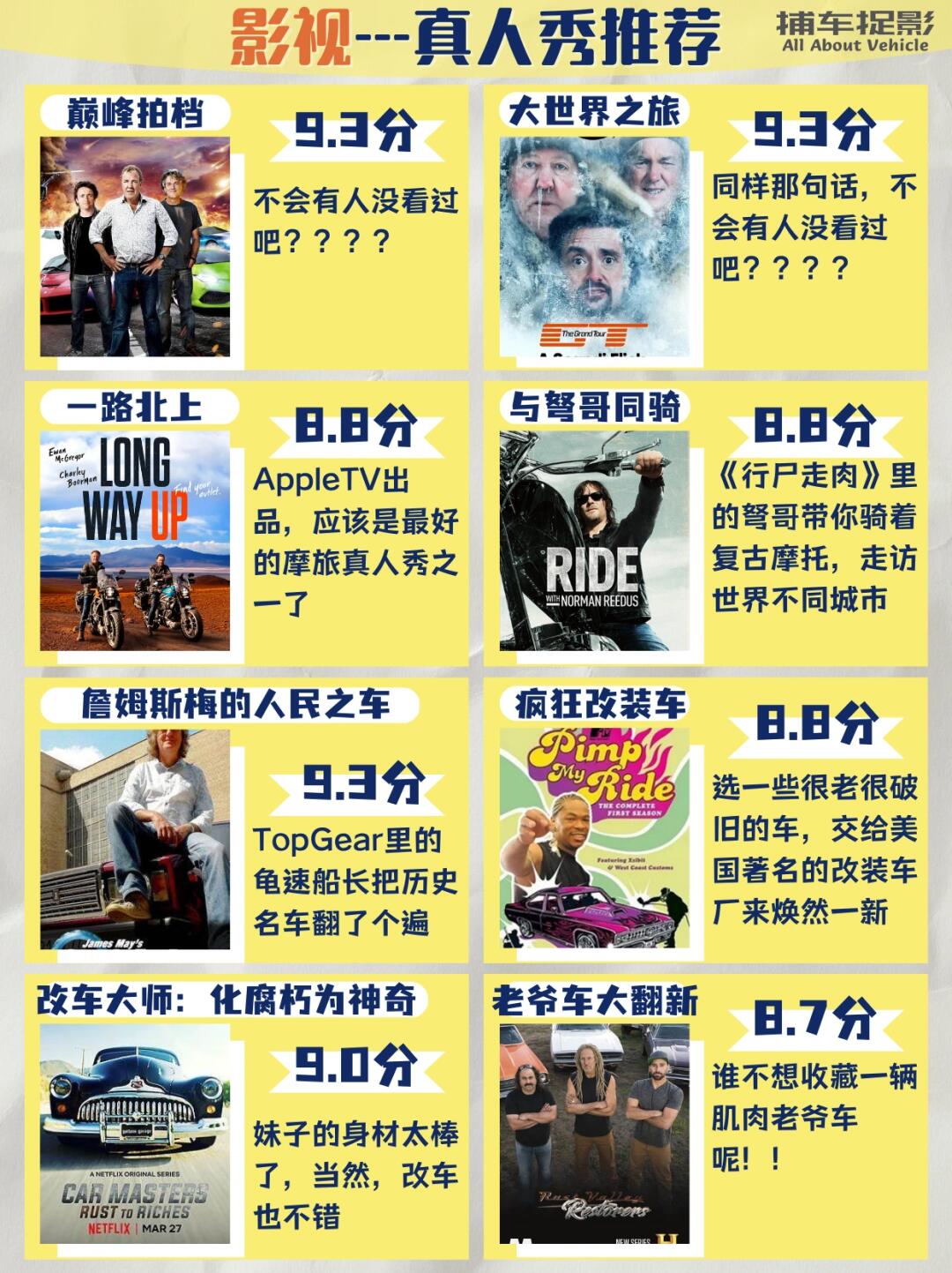 《Top Gear巅峰拍档》《The Ground Tour大世界之旅》《Long Way Up一路北上》《Ride with Norman Reedus与弩哥同骑》《James May’s Cars of the People詹姆斯梅的人民之车》《改车大师:化腐朽为神奇》《老爷车大翻新》《疯狂改装车》