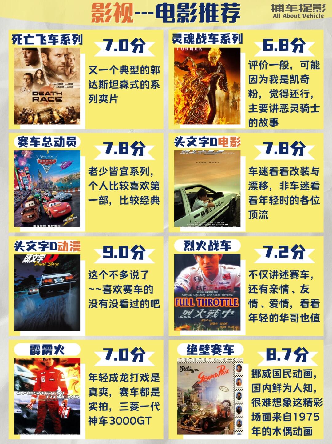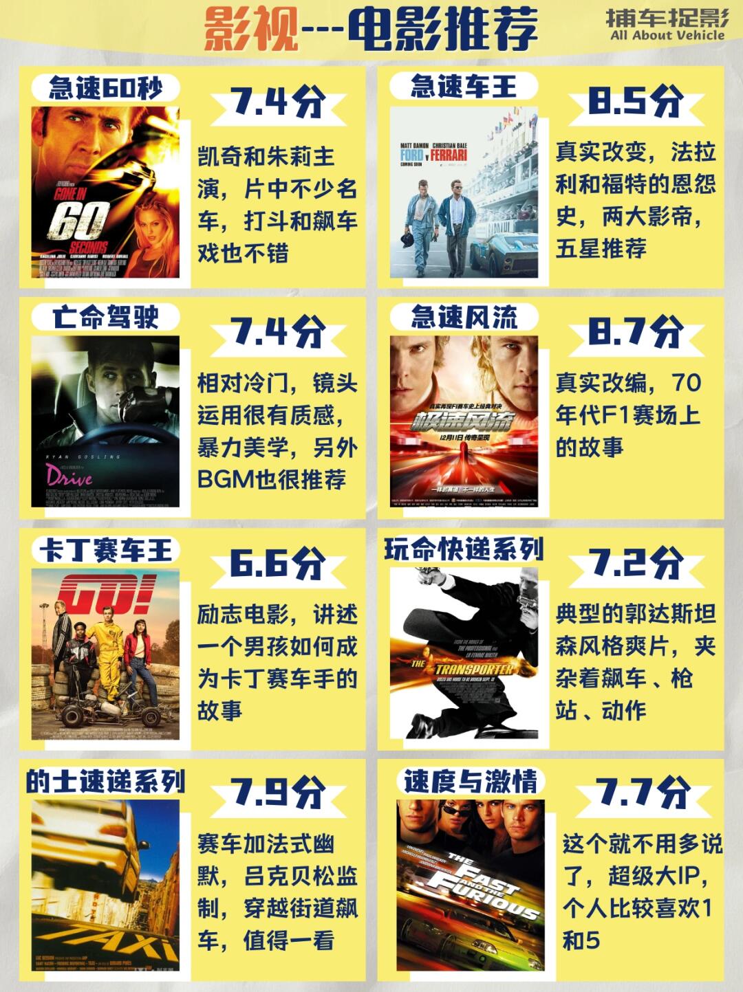 《烈火战车》《霹雳火》《头文字D》电影《极速60秒》《速度与激情系列》《极速车王》《亡命驾驶》《极速风流》《卡丁赛车王》《玩命快递系列》《的士速递系列》《死亡飞车系列》《灵魂战车系列》《赛车总动员系列》《头文字D》动漫