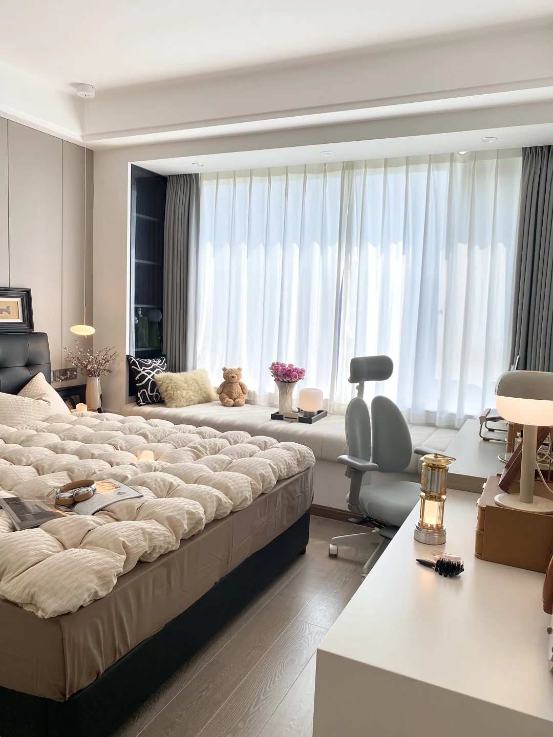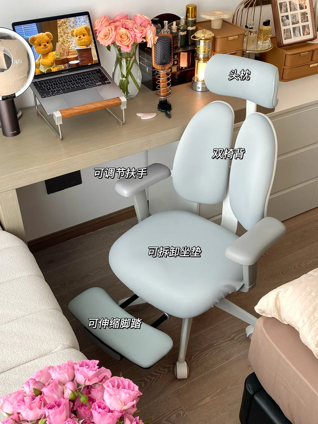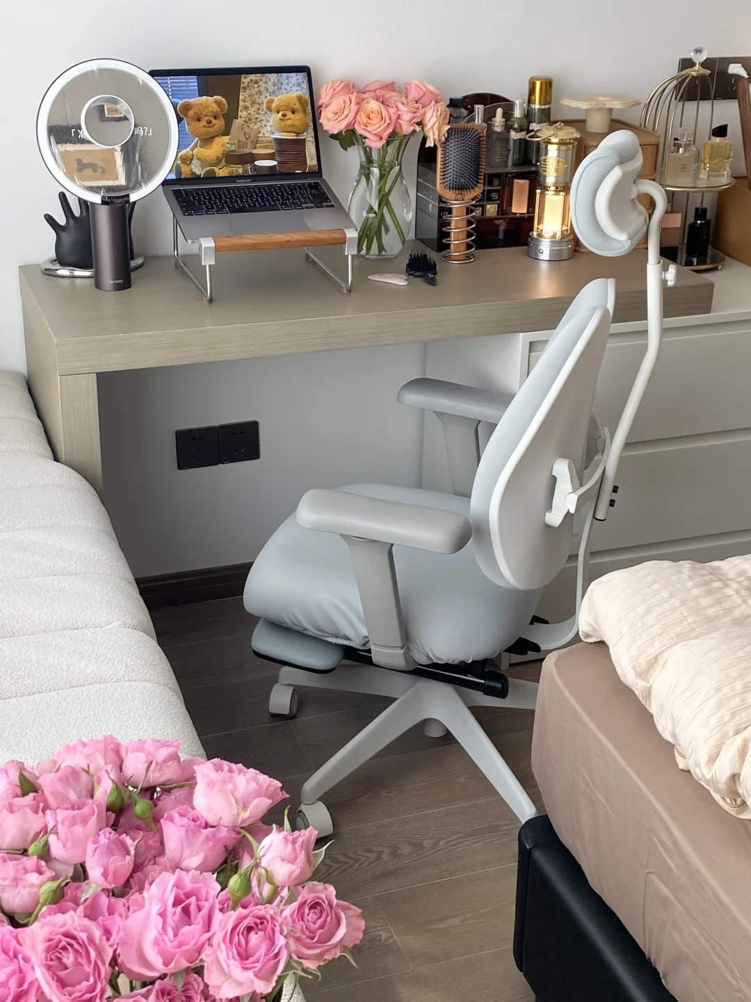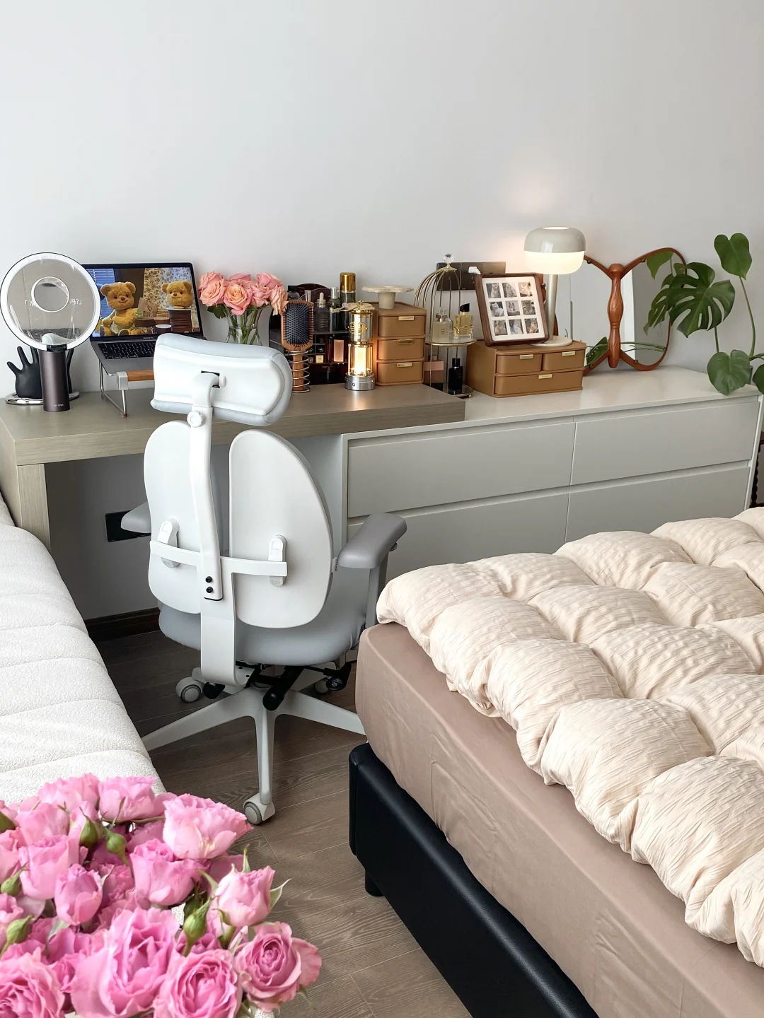 hi hi大家好,欢迎来到咩咩的小房间 主卧大概13平米,布置得温馨舒适,把自己喜欢的都给自己安排上啦 左侧做了奶茶色一门到顶衣柜,柜门直接开槽处理,最里面一扇柜门断开,不影响开关 60厘米大飘窗不能砸,那就铺上软乎乎的垫子,平时晒晒太阳也不错 我还做了一组黑玻飘窗柜,可以收纳一些杂物 床尾放了斗柜+梳妆台一体,不仅收纳能力拉满,平时在这里化妆办公也不错~ . 本人是一个互联网牛马,经常回家还要码字办公,所以卧室办公区域给自己安排上了很舒服的人体工学椅 我选的是这款普格瑞司云朵系列双背人体工学椅 双背设计真的对腰部太友好了,包裹感很强,长期久坐也不会觉得腰酸背痛 4D软PU的扶手可以上下前后左右转动,内宽45厘米,很符合女生的肩膀宽度 下面还有可伸缩脚踏,平时办公累了,把脚搁起来别提多舒服了 坐垫表面是可以拆卸的,再也不会担心弄脏了没办法清理 . 现在下班就喜欢待在属于自己的小房间里,边听歌边写文案,太舒服啦~