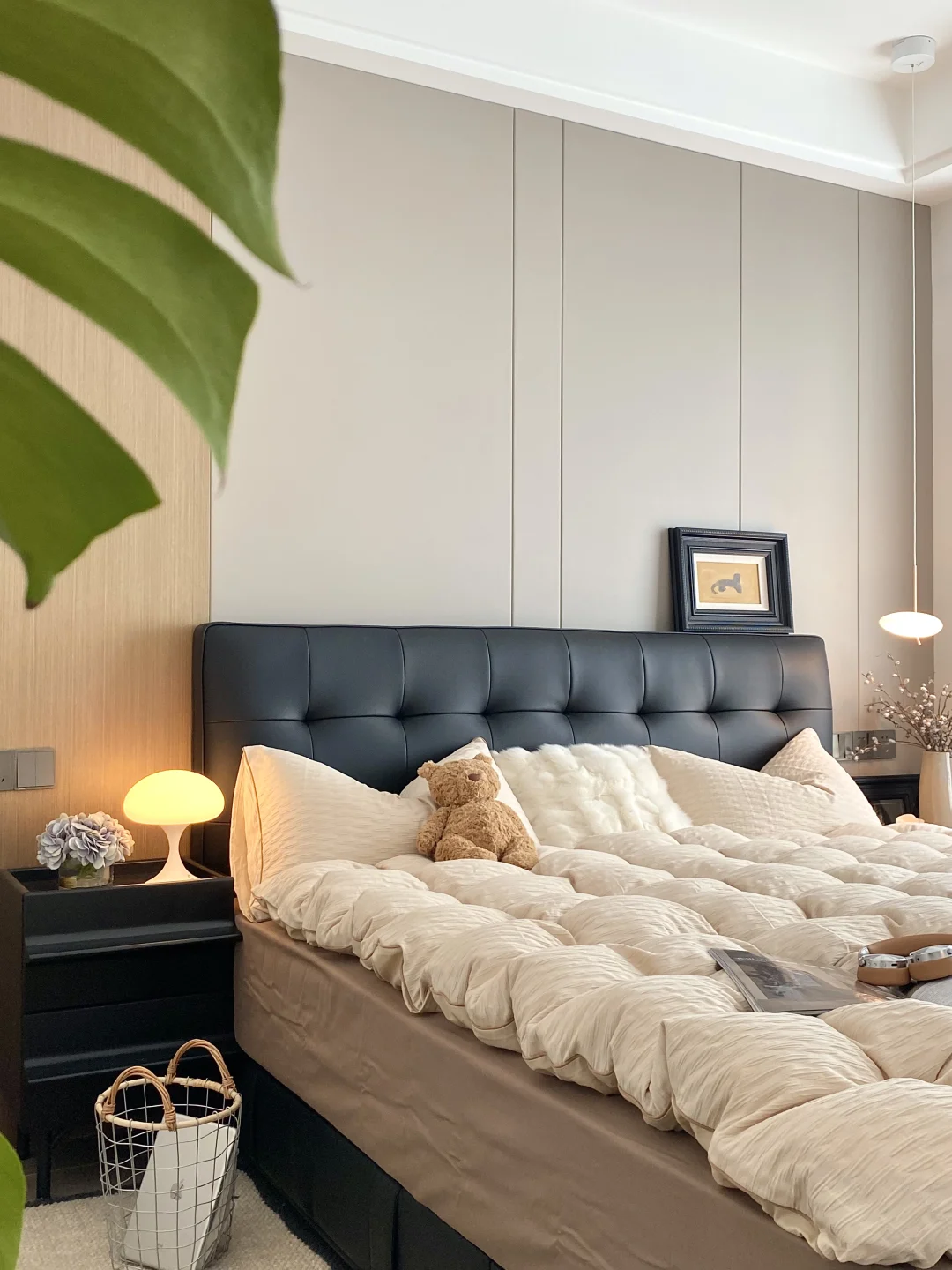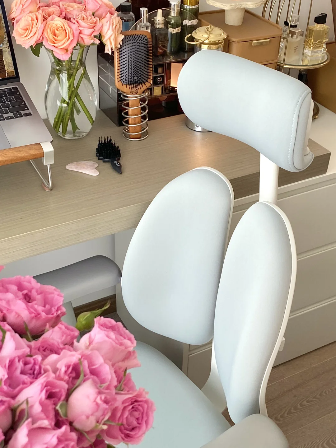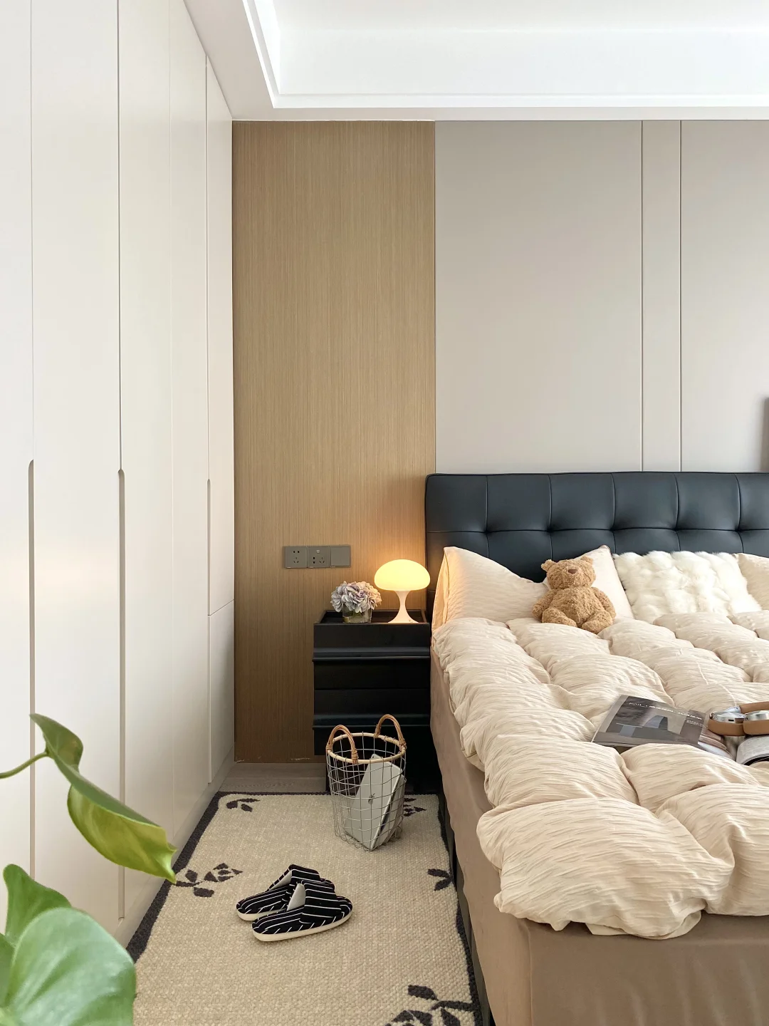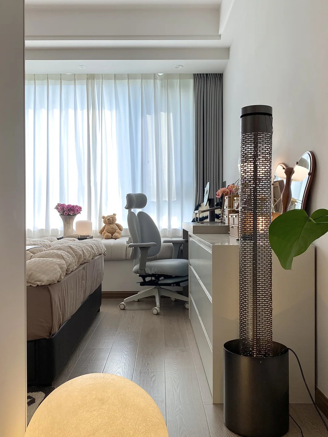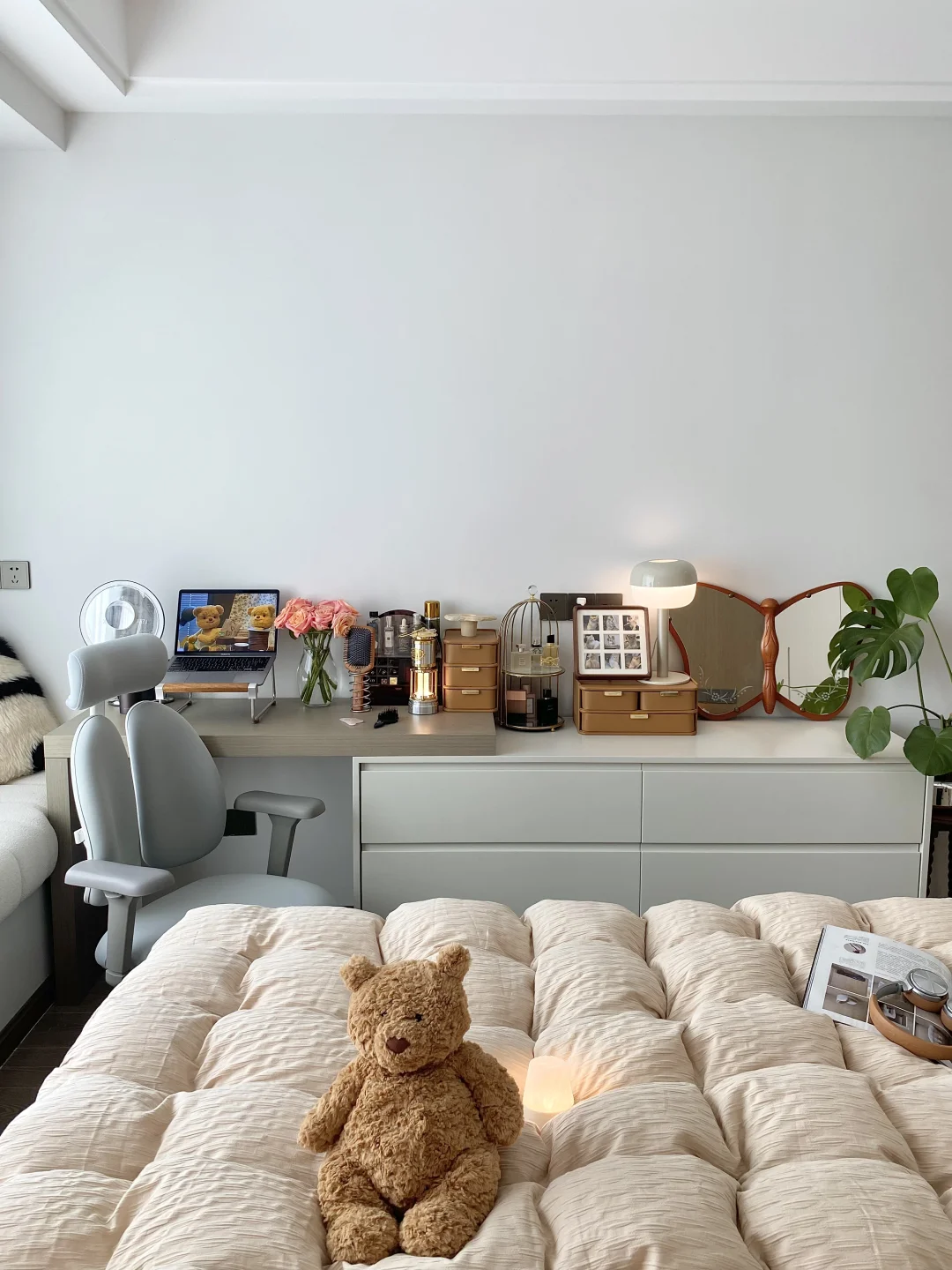 hi hi大家好,欢迎来到咩咩的小房间 主卧大概13平米,布置得温馨舒适,把自己喜欢的都给自己安排上啦 左侧做了奶茶色一门到顶衣柜,柜门直接开槽处理,最里面一扇柜门断开,不影响开关 60厘米大飘窗不能砸,那就铺上软乎乎的垫子,平时晒晒太阳也不错 我还做了一组黑玻飘窗柜,可以收纳一些杂物 床尾放了斗柜+梳妆台一体,不仅收纳能力拉满,平时在这里化妆办公也不错~ . 本人是一个互联网牛马,经常回家还要码字办公,所以卧室办公区域给自己安排上了很舒服的人体工学椅 我选的是这款普格瑞司云朵系列双背人体工学椅 双背设计真的对腰部太友好了,包裹感很强,长期久坐也不会觉得腰酸背痛 4D软PU的扶手可以上下前后左右转动,内宽45厘米,很符合女生的肩膀宽度 下面还有可伸缩脚踏,平时办公累了,把脚搁起来别提多舒服了 坐垫表面是可以拆卸的,再也不会担心弄脏了没办法清理 . 现在下班就喜欢待在属于自己的小房间里,边听歌边写文案,太舒服啦~