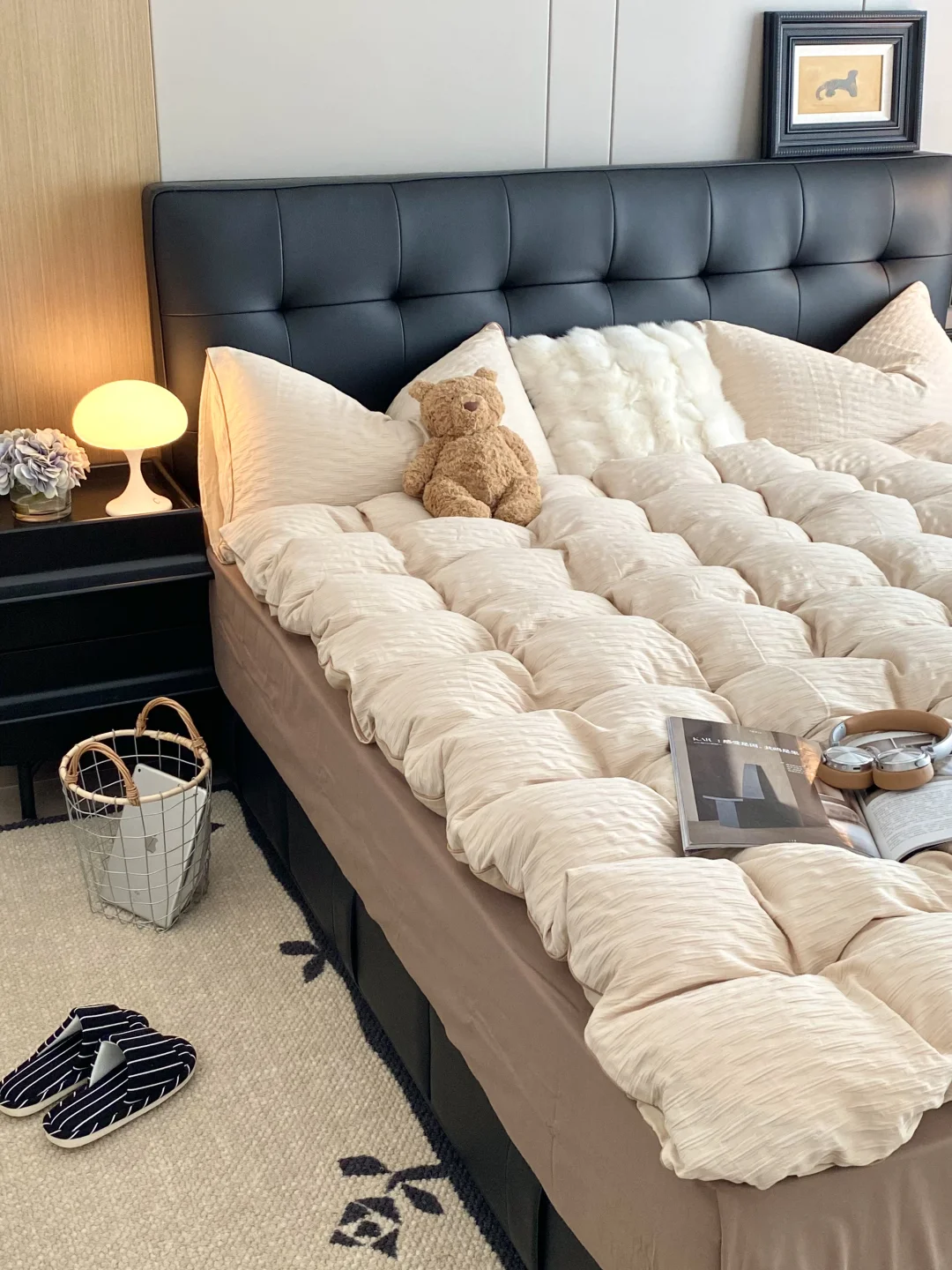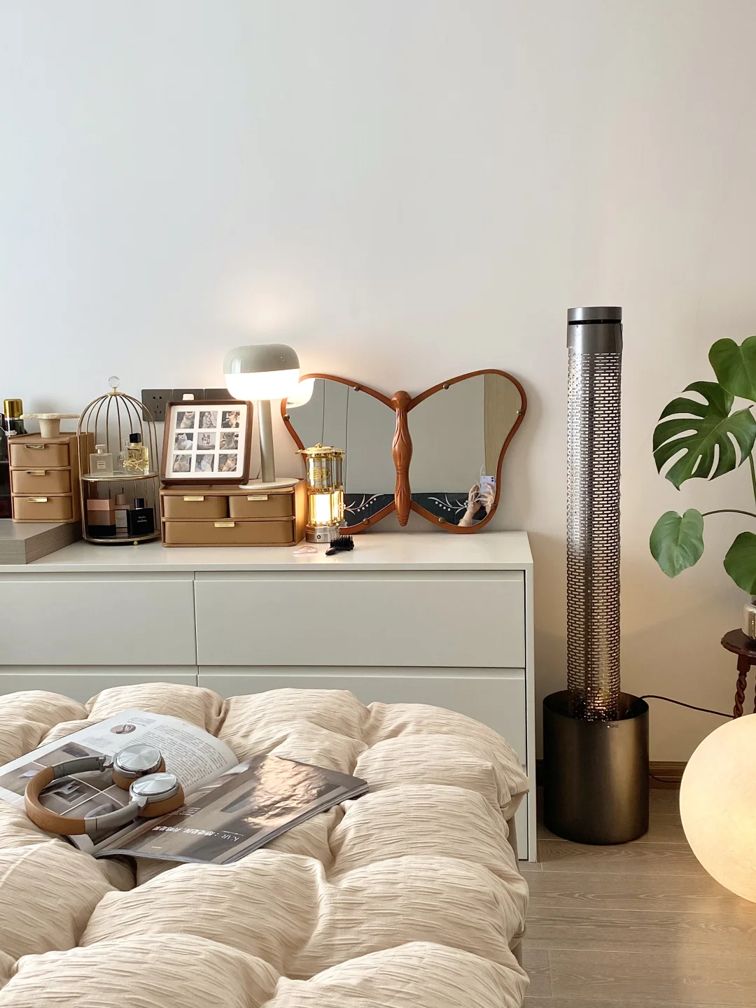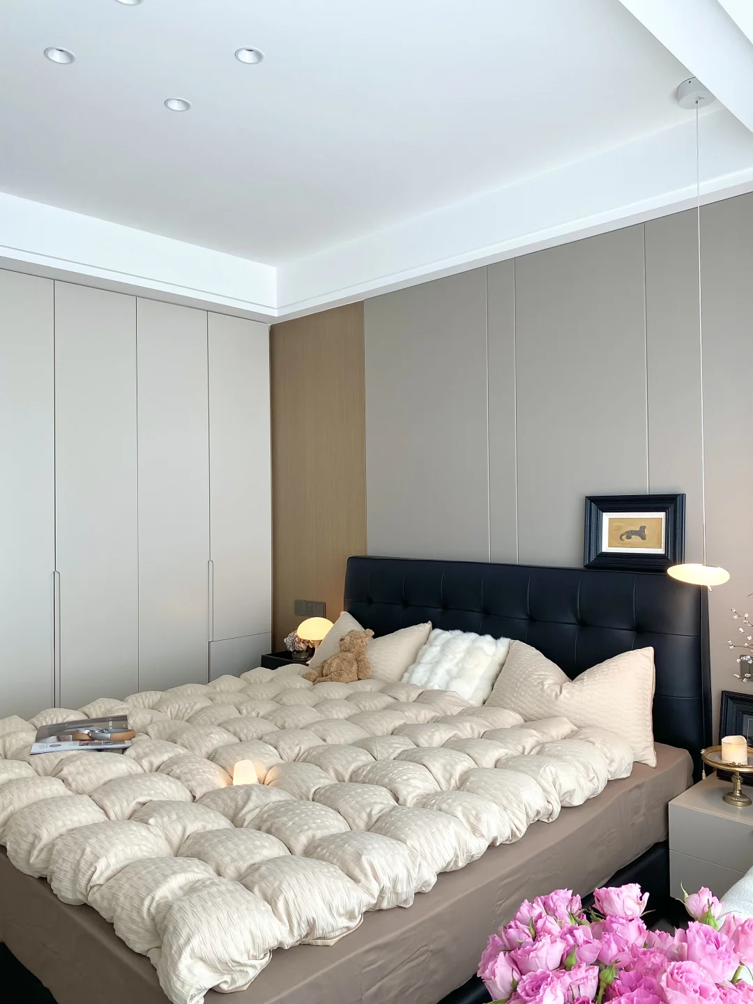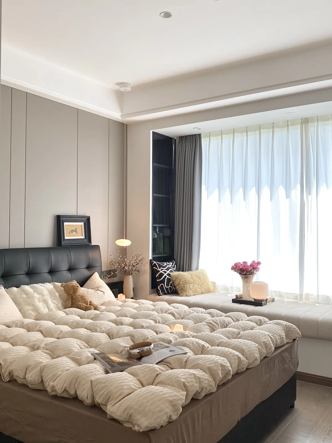 hi hi大家好,欢迎来到咩咩的小房间 主卧大概13平米,布置得温馨舒适,把自己喜欢的都给自己安排上啦 左侧做了奶茶色一门到顶衣柜,柜门直接开槽处理,最里面一扇柜门断开,不影响开关 60厘米大飘窗不能砸,那就铺上软乎乎的垫子,平时晒晒太阳也不错 我还做了一组黑玻飘窗柜,可以收纳一些杂物 床尾放了斗柜+梳妆台一体,不仅收纳能力拉满,平时在这里化妆办公也不错~ . 本人是一个互联网牛马,经常回家还要码字办公,所以卧室办公区域给自己安排上了很舒服的人体工学椅 我选的是这款普格瑞司云朵系列双背人体工学椅 双背设计真的对腰部太友好了,包裹感很强,长期久坐也不会觉得腰酸背痛 4D软PU的扶手可以上下前后左右转动,内宽45厘米,很符合女生的肩膀宽度 下面还有可伸缩脚踏,平时办公累了,把脚搁起来别提多舒服了 坐垫表面是可以拆卸的,再也不会担心弄脏了没办法清理 . 现在下班就喜欢待在属于自己的小房间里,边听歌边写文案,太舒服啦~