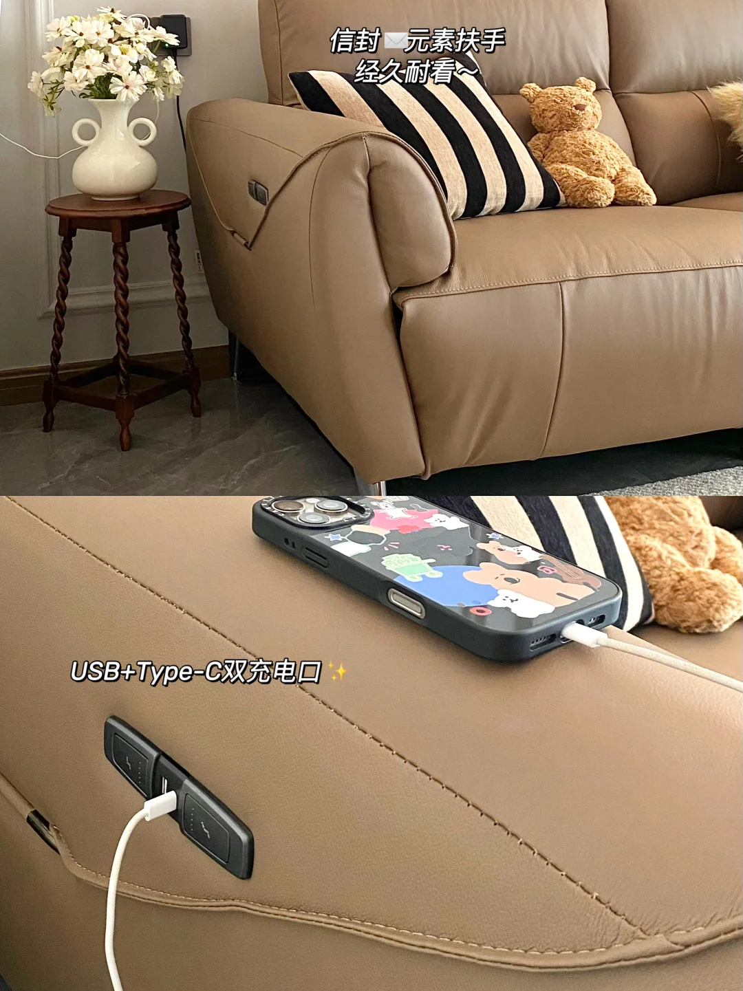扶手是芝华仕的经典信封元素,金属和真皮搭配真的质感拉满,而且头靠在扶手上很舒服,旁边还有USB和Type-C充电口,手机没电了可以随时充电很方便。