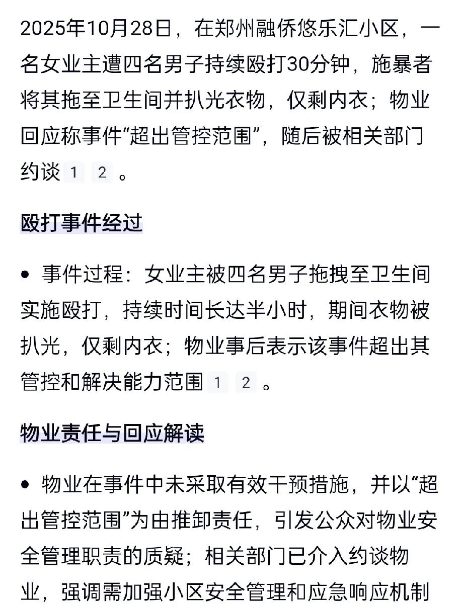 很奇怪的新闻!郑州女业主被四个大汉扒光衣服拖至卫生间殴打半小时,物业保安“不敢阻拦”。 1.打人原因呢?为什么被打?还是四个男的打一个女的。 2.打人为什么要扒光衣服?什么时候打人需扒光衣服,剩内衣打?还拖至卫生间打? 3.四个大汉没吃饭吗?所以要打半个小时,半个小时女的竟然还能站着说话? 4.结果呢?打得人拘留了吗?后续如何? 事有蹊跷,让子弹在飞会吧。