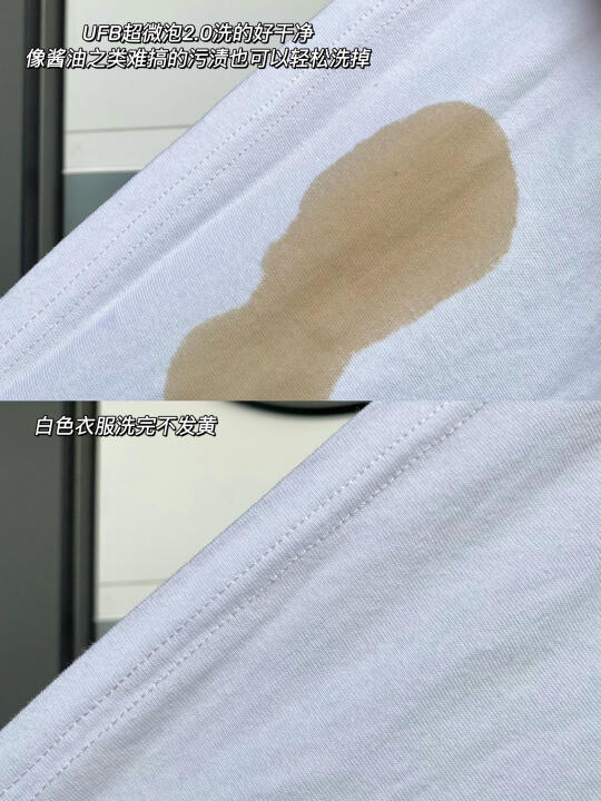 日常难洗的油渍酱渍也能轻松解决掉,像我平时穿的白色外套都洗得干干净净不泛黄,再也不用手搓半天了!