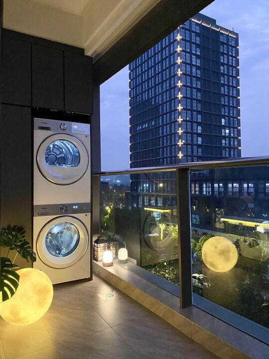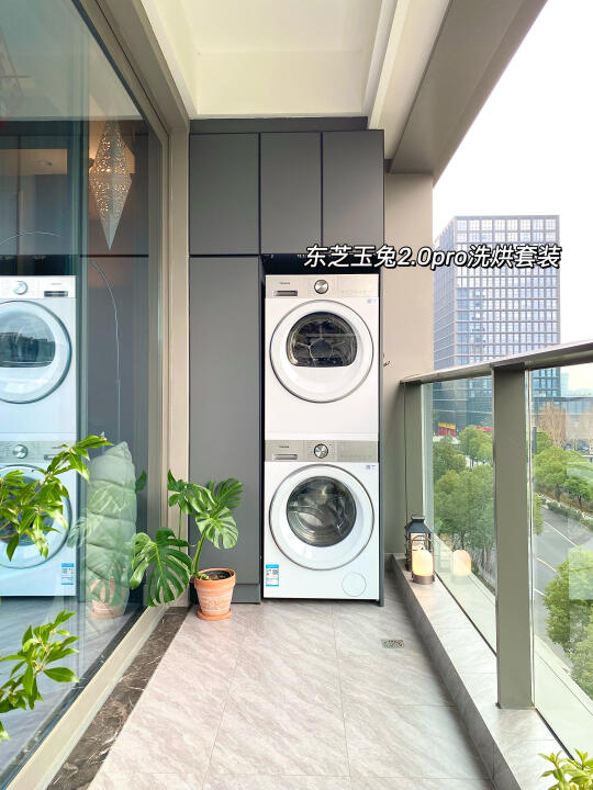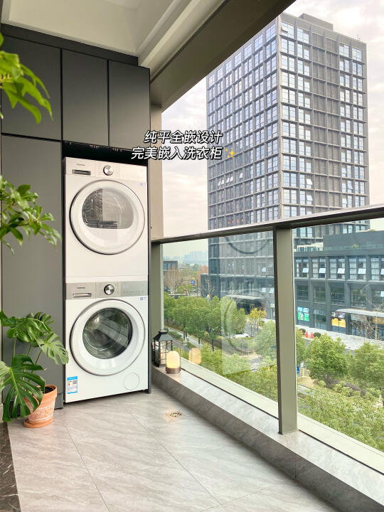 但是我家是开放式阳台嘛,长期日晒雨淋的就担心机器会不会发黄生锈,幸好这套洗烘用的是高耐候材质,可以有效阻隔紫外线和潮气入侵,防止发霉生锈,开放式阳台也能轻松维持高颜值啦!