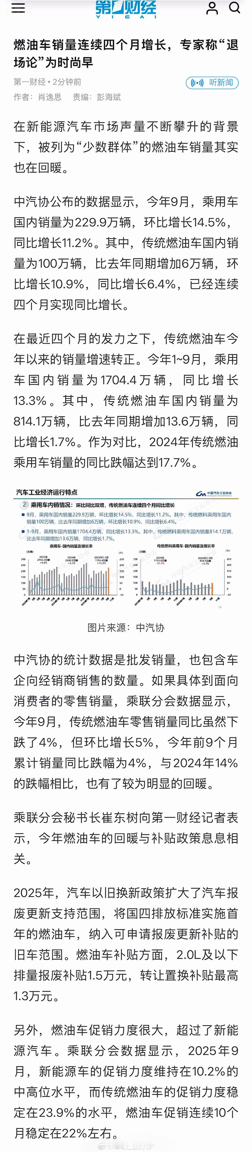 专家称燃油车退场论仍为时尚早 新能源声势浩大,燃油车却悄悄回暖。中汽协数据显示,今年9月传统燃油车卖了100万辆,比去年多6万辆,连续四个月同比增长;前九个月总销量814.1万辆,同比也终于由跌转增(涨了1.7%)。要知道去年全年燃油车销量可是跌了17.7%,如今能缓过劲儿来,说明市场仍有它的“刚需”。