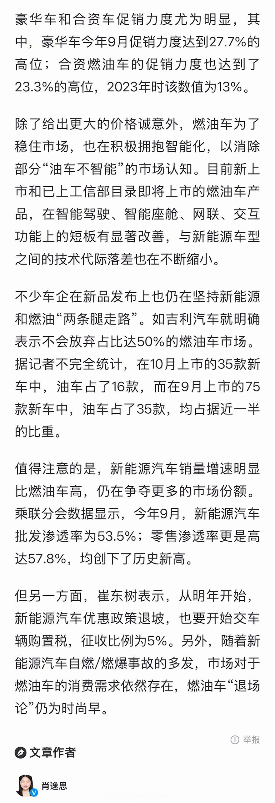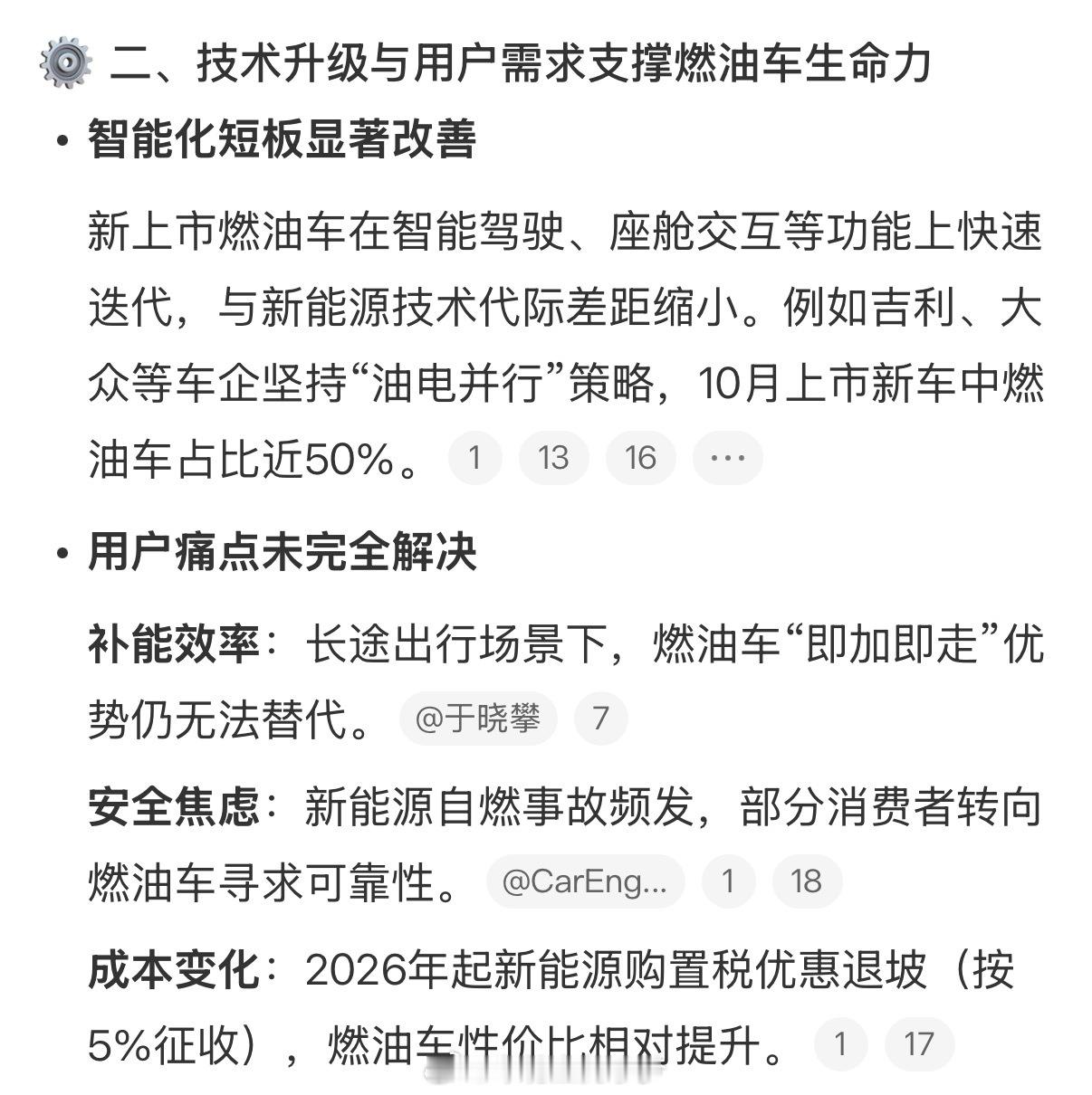 专家分析,一方面新能源汽车明年要开始交购置税(税率5%),优惠力度减弱;另一方面,自燃等安全事件频发,让不少消费者更倾向“熟悉的老伙计”。燃油车或许不再是“主角”,但要说它马上退场?数据摆在这儿——至少现在,它还在稳稳接住一部分人的需求。大v聊车新能源汽车