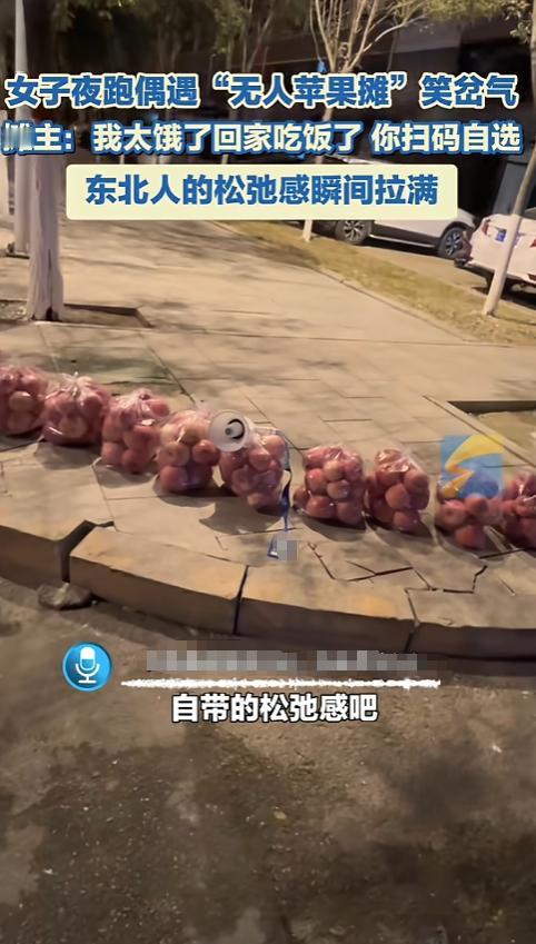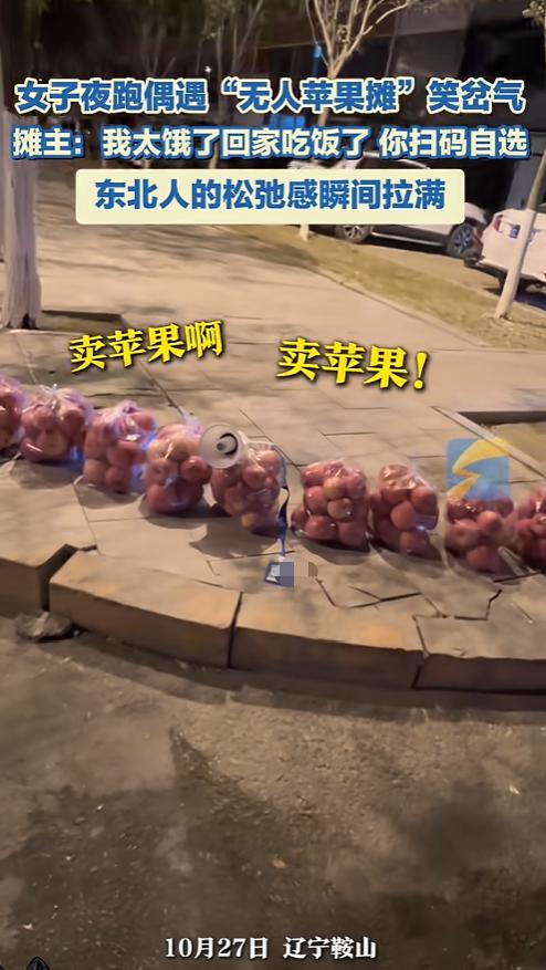 “笑不活了!”10月27日,辽宁鞍山,一女子夜跑时遇到了个无人苹果摊,几袋苹果整整齐齐摆在地上,摊主用一个大喇叭在喊着自己回家吃饭了,要买苹果自助购买,这可把女子笑岔了气!网友:这就是东北人的松弛感吗! 在人们的印象中东北人热情奔放、不拘小节,有时他们的松弛感往往超乎你的想象。 一女子夜跑时偶遇了一个奇怪的苹果摊,只见几袋又大又红的苹果整整齐齐打包好,放在路边一字排开,可小摊无人看管,摊主不知所踪,只留下了一个收款二维码。 正当女子疑惑时,苹果上面的大喇叭传出摊主的声音,摊主称自己太饿了,必须回家吃饭,如果要购买苹果,请自行扫码购买,他还幽默地表示,20块钱买不了吃亏,买不了上当。 这些话配上摊主的东北口音,有种说不出来的喜感,女子在路边笑岔了气,正常来说,摊主如果回家吃饭都会把货物先收走,这个苹果摊摊主的心未免也有些太大了,不过这种信任感让人心暖暖的。 不少网友感慨这就是东北人的松弛感吗,不得不说,小摊虽然无人看管,但听摊主这意思估计也没有人会趁机偷拿,摊主虽然不在现场叫卖,但大喇叭里幽默的宣传也能吸引路人驻足! 信息来源:《女子夜跑偶遇“无人苹果摊”笑岔气,摊主:我太饿了回家吃饭了,你扫码自选!》闪电新闻