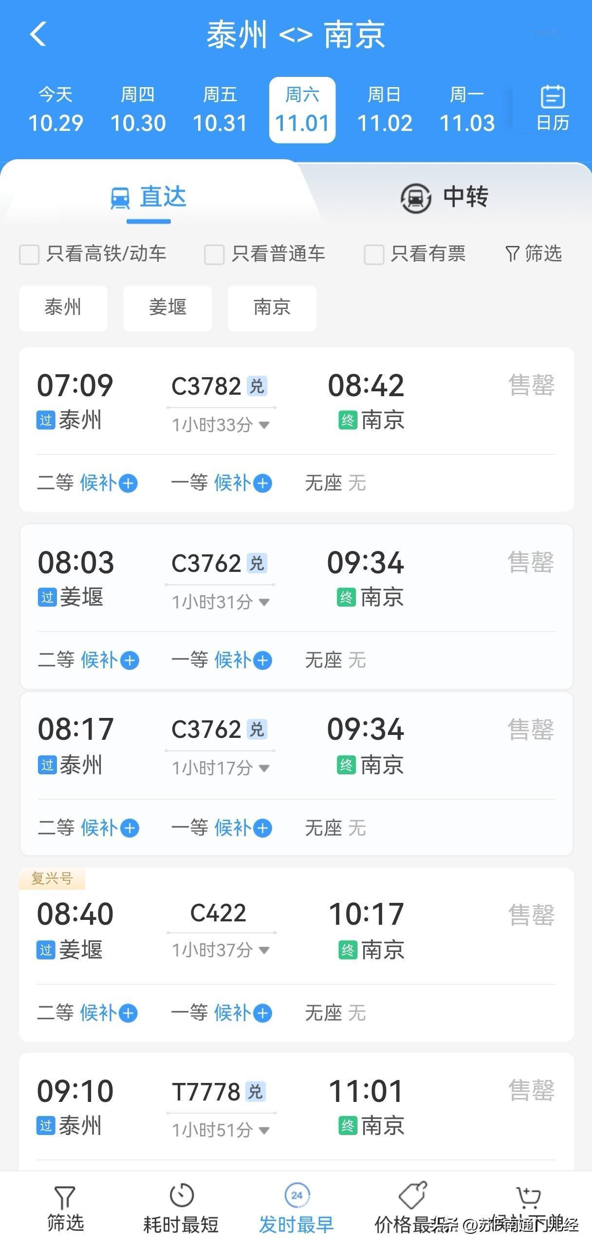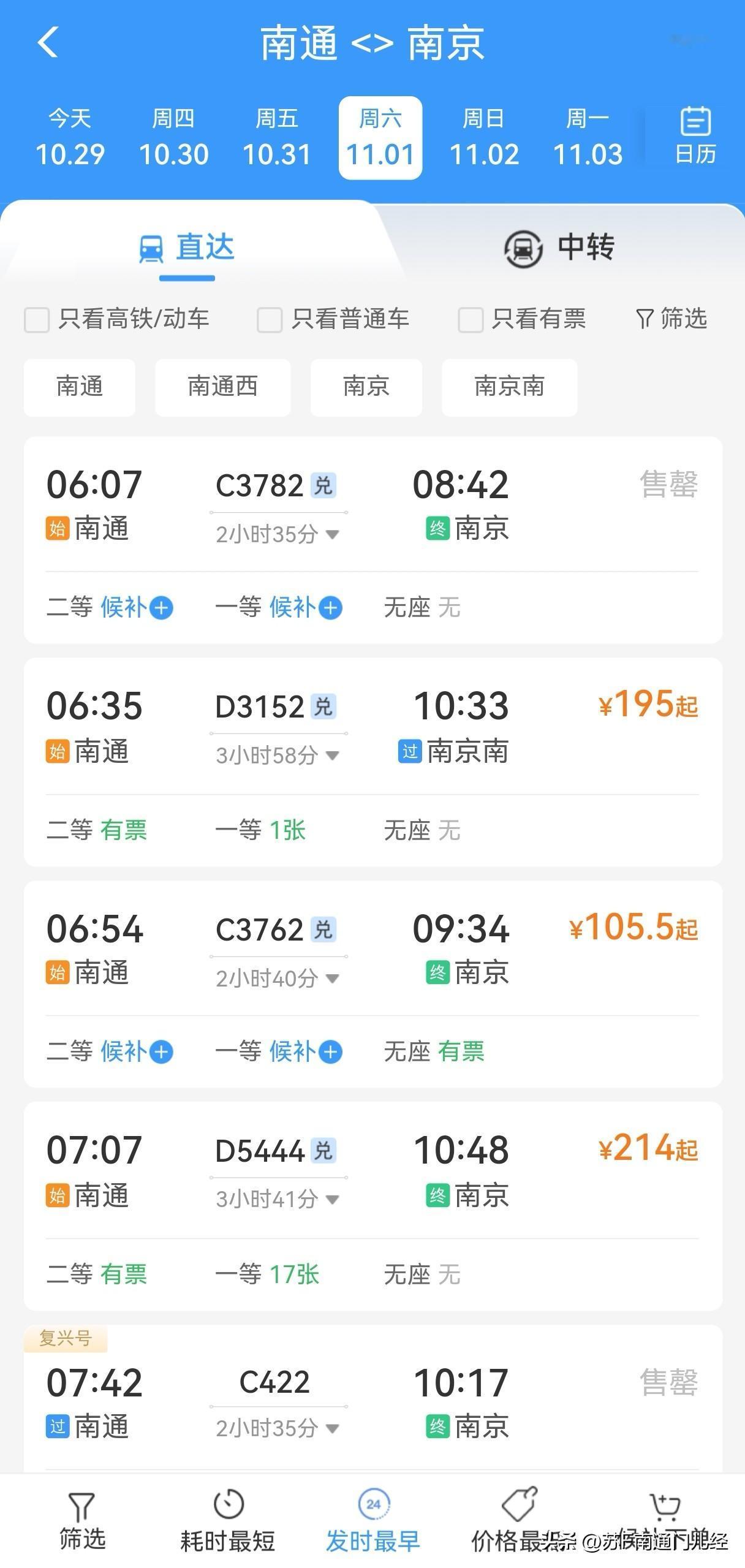 苏超决赛两个对手,南通和南通,到南京的铁路班次都不是很多。泰州一天25班到南京,南通17班。有意思的是,泰州11月1日当天票基本售罄,而南通到南京还有大量余票。只有一种解释了,南通球迷分散于南通全域,从南通火车站或南通西站出发的有限。