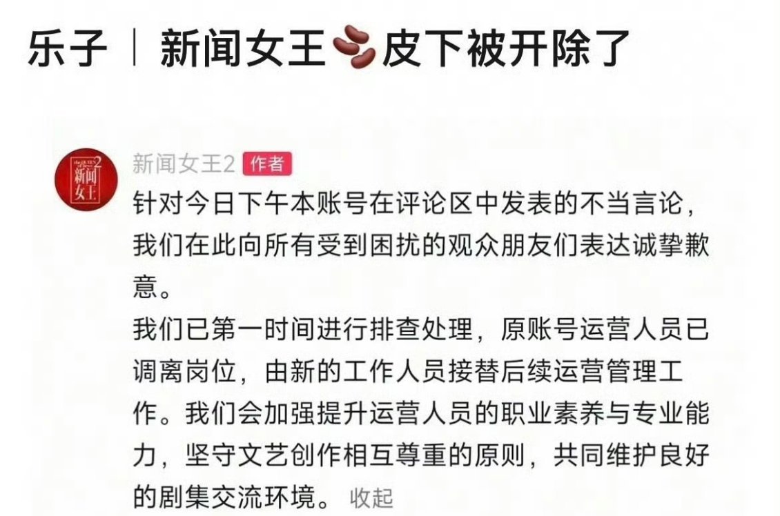 新闻女王账号运营人员被开除因为有评论说是《许我耀眼》想拍出来的感觉,皮下回复“不是一个赛道” 这位运营现在已经被开除了并且道歉了