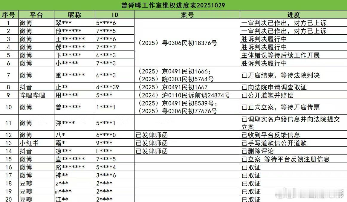 曾舜晞全平台告黑维权进度曾舜晞方公布告黑进展 10月29日,方公布全平台告黑维权进度“针对此前部分网络用户捏造不实信息、公开发表对曾舜晞先生的侮辱、诽谤性言论,我方均已委托律师进行取证并启动法律诉讼,法院也已陆续开庭审理。
