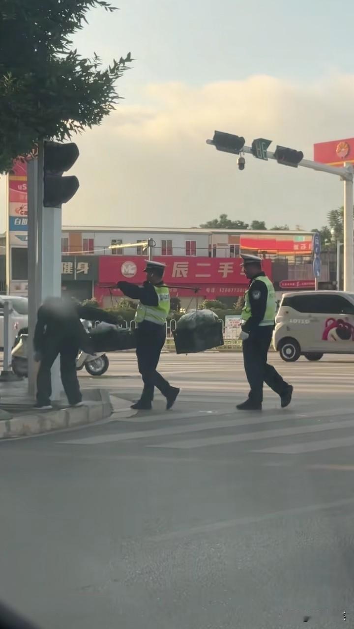 瞧瞧咱云南玉溪江川的交警,看到一老爷爷扛着扁担过马路,交警叔叔二话不说,将扁担“抢”了过来,扛在了自己的肩上!老爷爷背驼得很厉害,在交警叔叔的帮助下很快穿过了马路,另一名交警叔叔看到后过来接应,脸上也露出了亲切的笑容,正应了那句话:军民鱼水情啊!