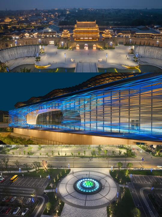 位于游客中心广场前的两片水幕,飞流直下的流水不用去迪拜也能感受同款瀑布非常震撼,夜景蓝调下灯光与水幕的结合,会更加梦幻
